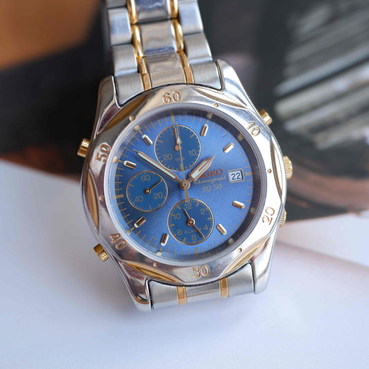 Vintage Seiko SQ50 Chronograph Quartz Blue Sunburst Dial 90s