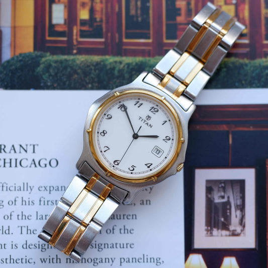 Vintage Titan Two Tone Quartz Watch 90s White Dial with Date