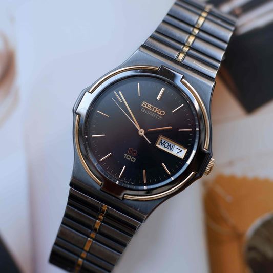Vintage Seiko SQ100 Day and Date Quartz Black and Gold from the 80s
