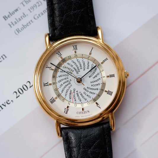 Vintage Citizen World Time Dress Watch 80s Gold White Dial Quartz
