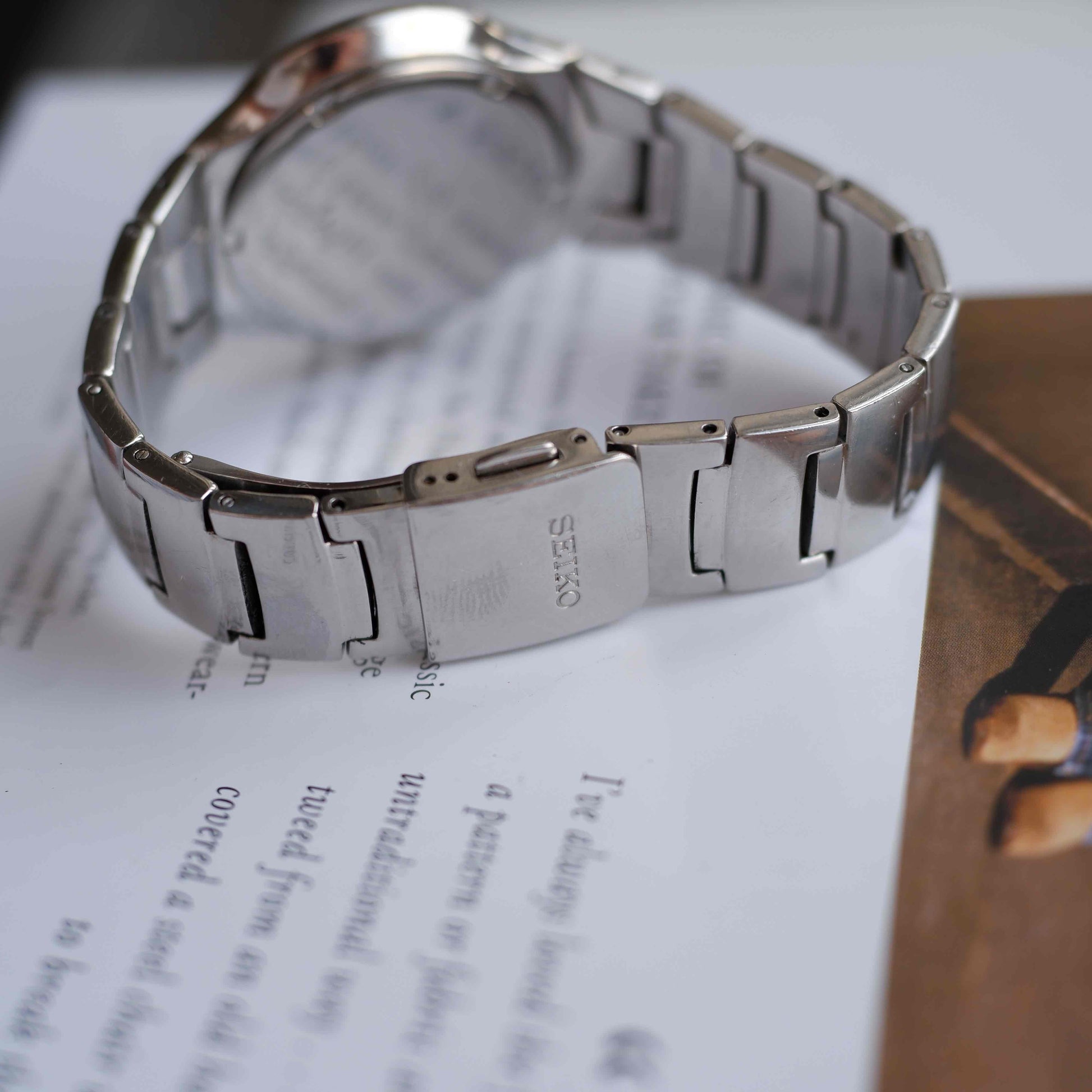The Seiko Premier Kinetic Auto Relay combines the precision of quartz with the innovation of kinetic technology. This early 2000s piece showcases Seiko’s engineering excellence and distinctive design. Its layered silver dial with deep-cut numerals, screw-set bezel, and sculpted bracelet lend it a modern, robust look with real wrist presence.