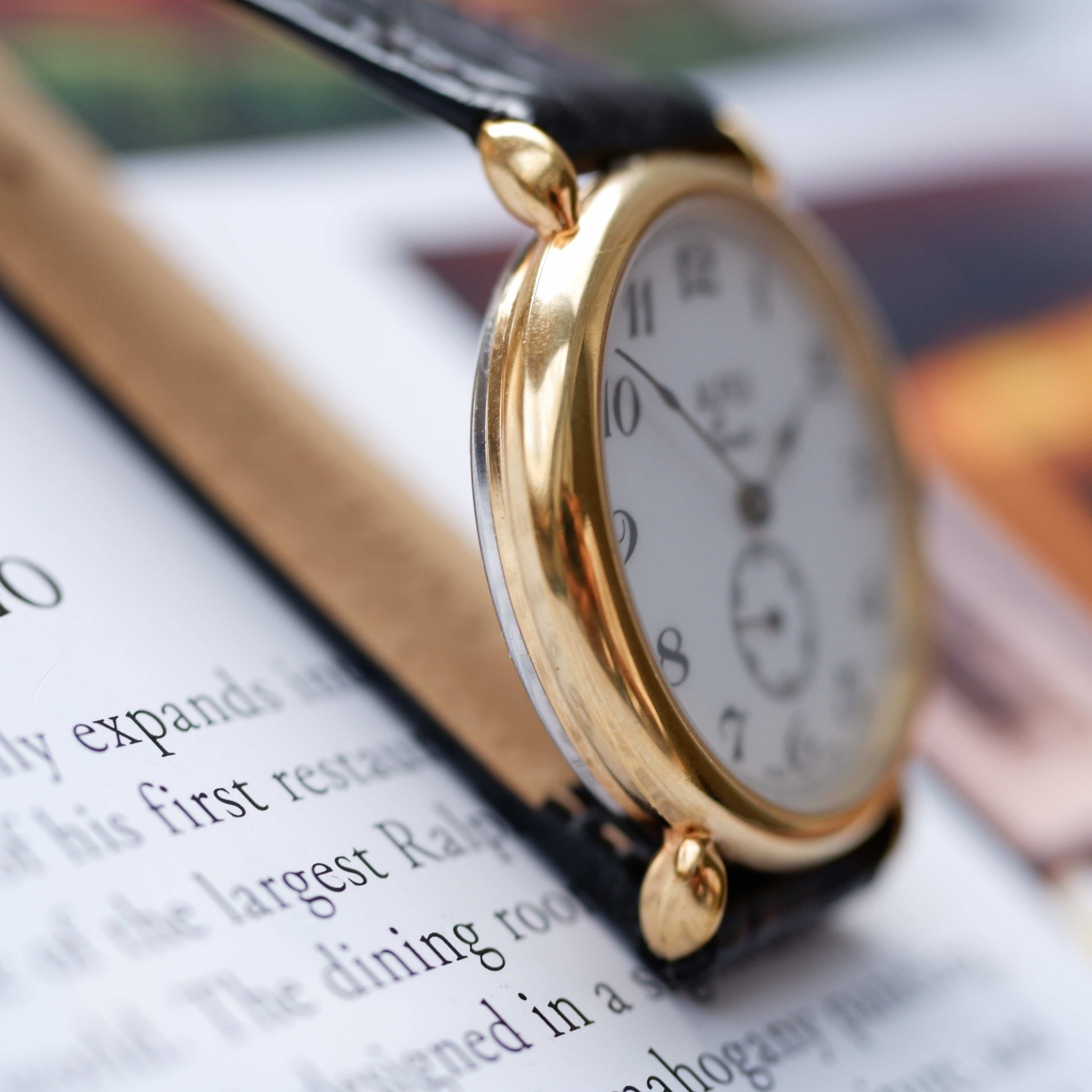 The Vintage Alfex Dress Watch from the 1990s features a gold tone case, enamel-style white dial with elegant Arabic numerals, and a charming small seconds subdial. Swiss-made and full of vintage character.