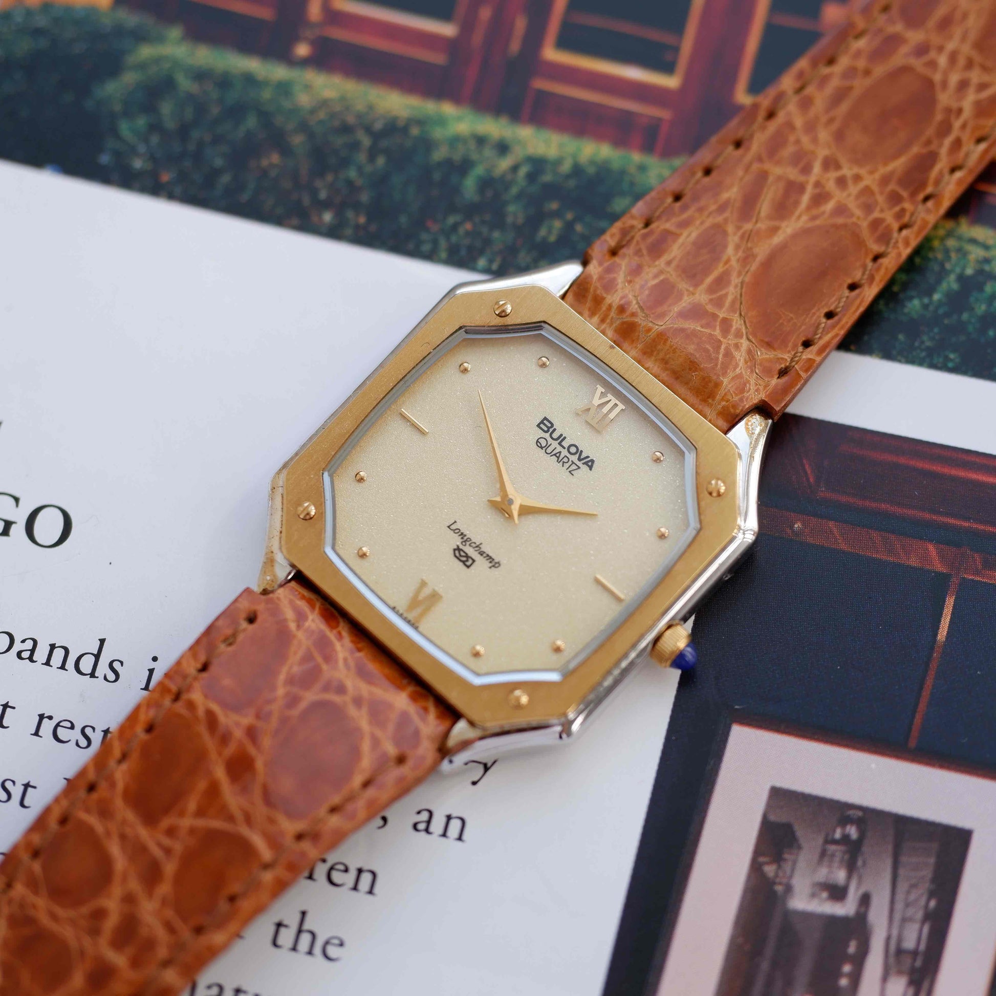New Old Stock Bulova Longchamp Quartz from the 1980s, featuring a champagne dial, faceted octagonal case, and slim profile. A rare, untouched vintage gem.