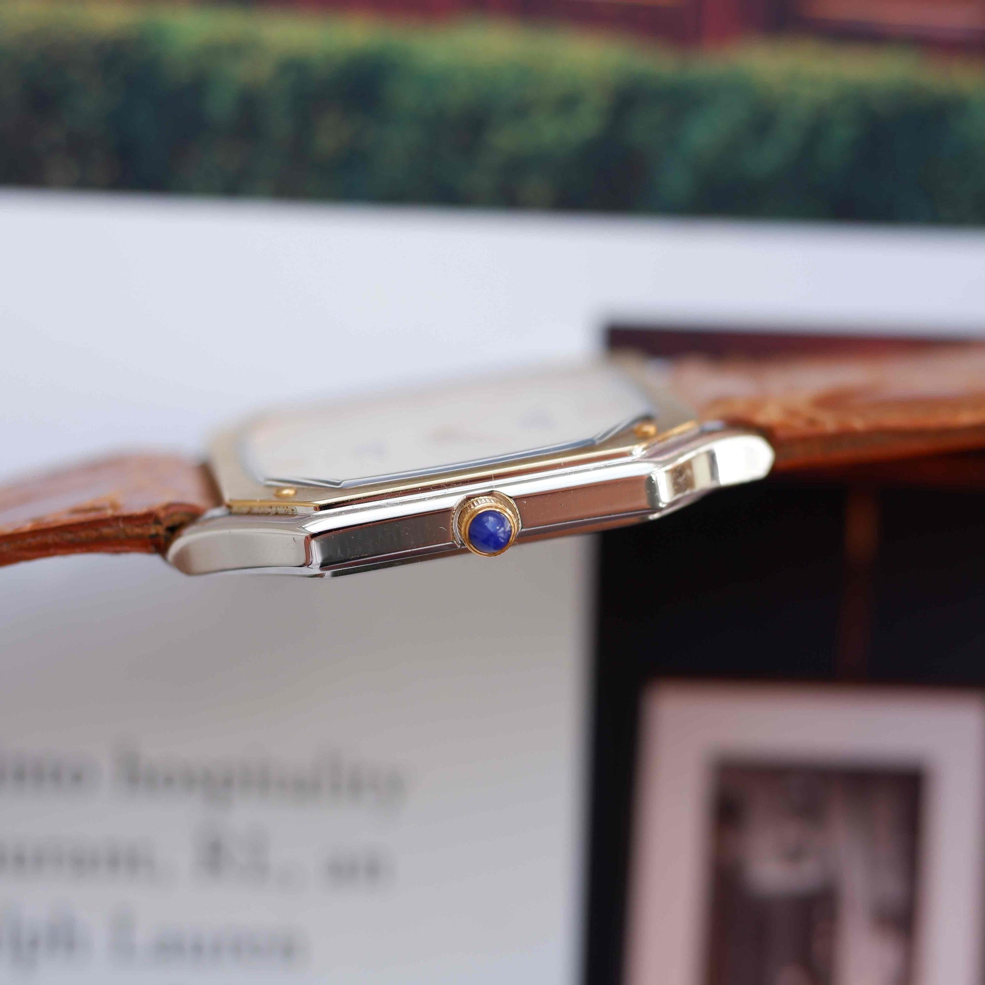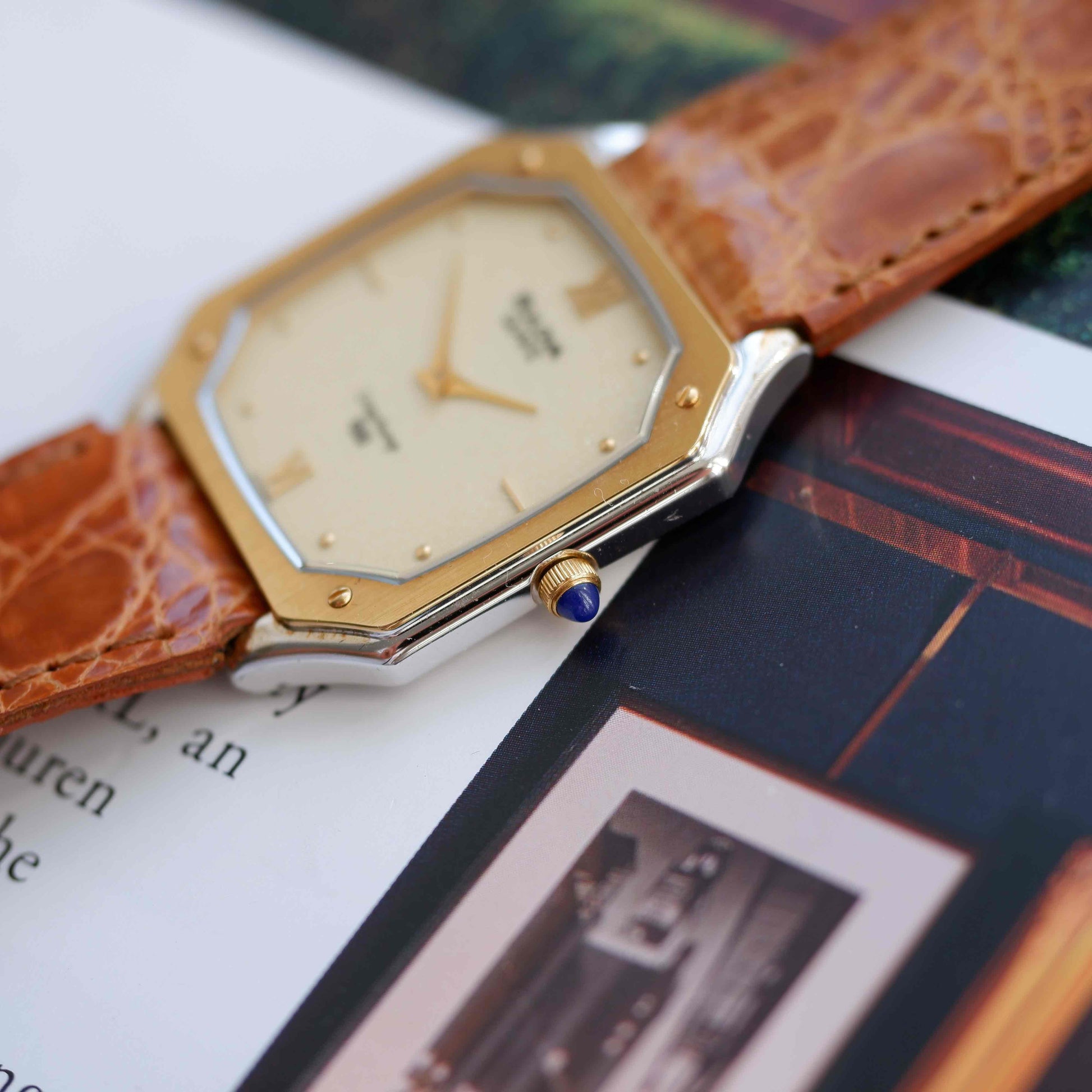 Housed in a refined octagonal case with a gold-tone bezel and slim profile, it blends the precision of quartz with the aesthetics of classic Swiss design. The blue cabochon crown adds a final touch of vintage charm.