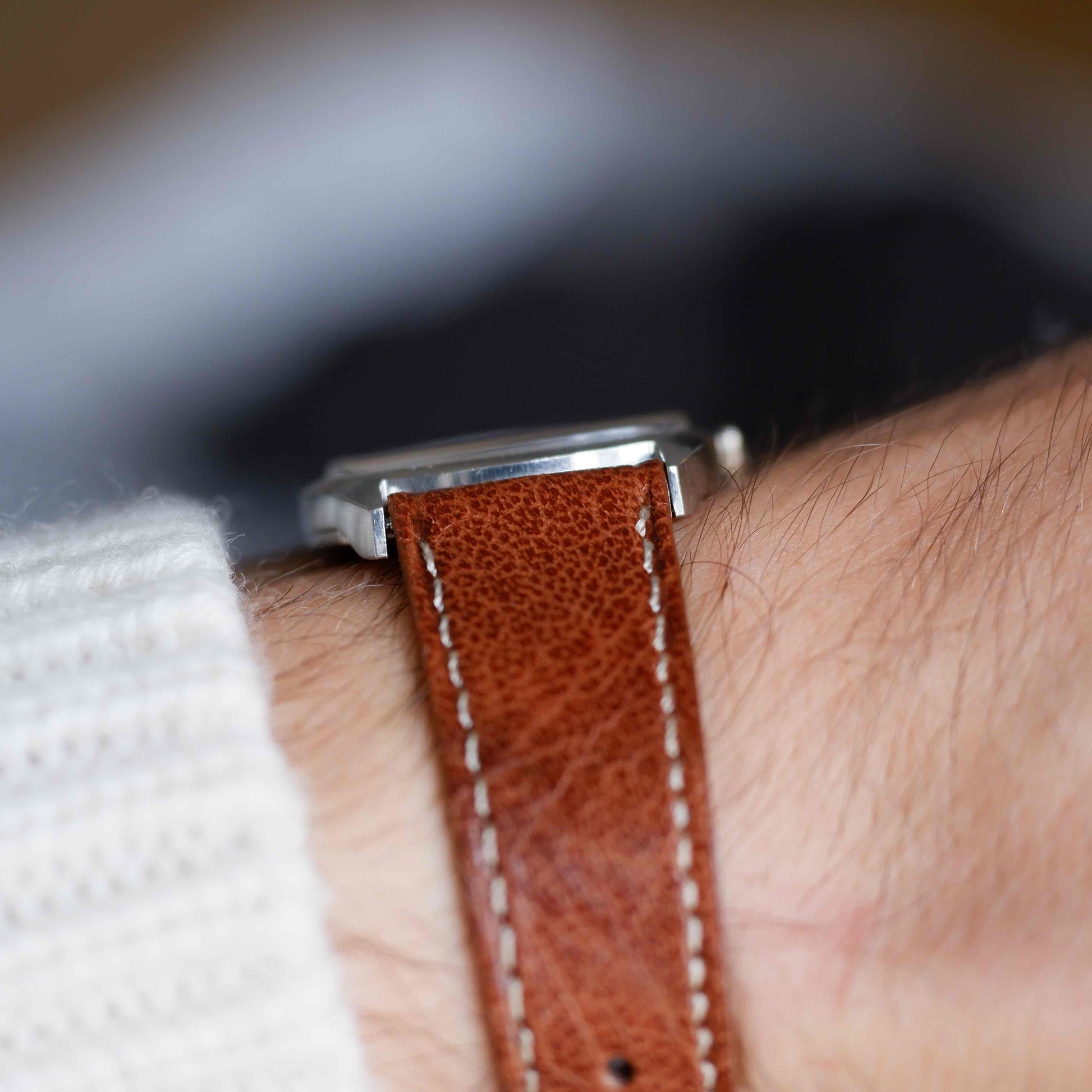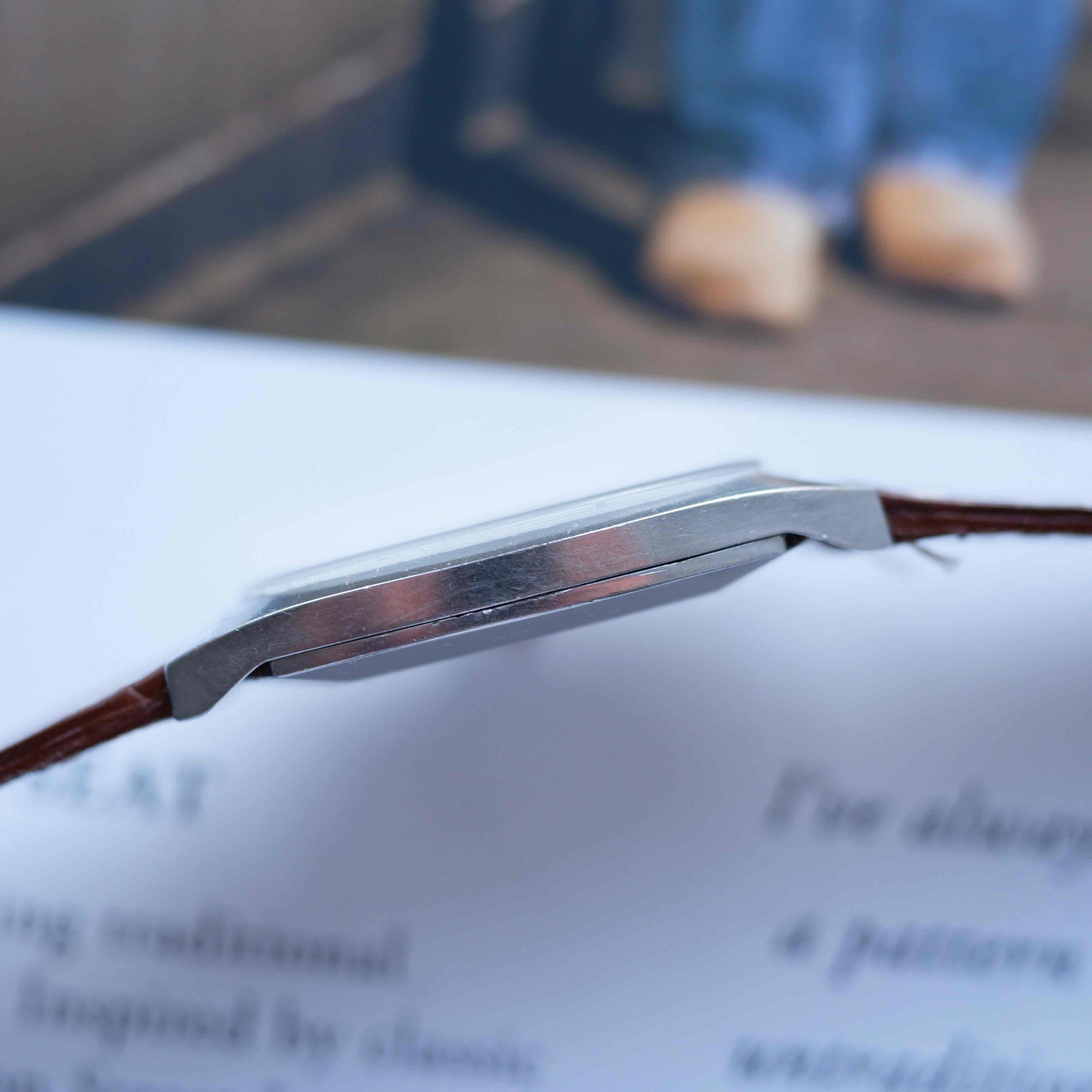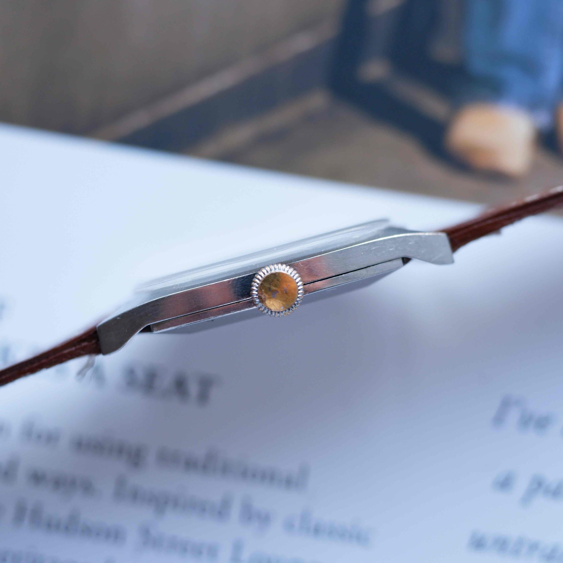 This piece showcases a beautiful blue dial with applied indices and a brushed steel case in an unusual cushion shape—an aesthetic nod to mid-century modernism. Inside, a reliable Swiss manual movement keeps things ticking without fuss.