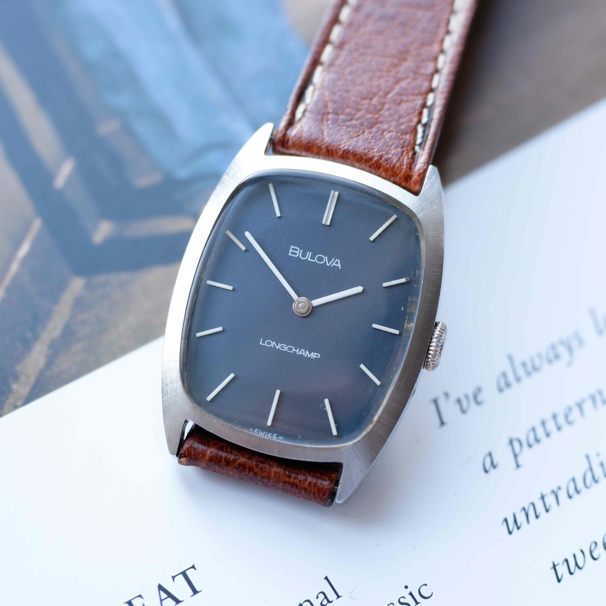 This 1970s Bulova Longchamp features a deep blue dial, sleek baton hands, and a minimalist cushion case, powered by a Swiss manual-wind movement.