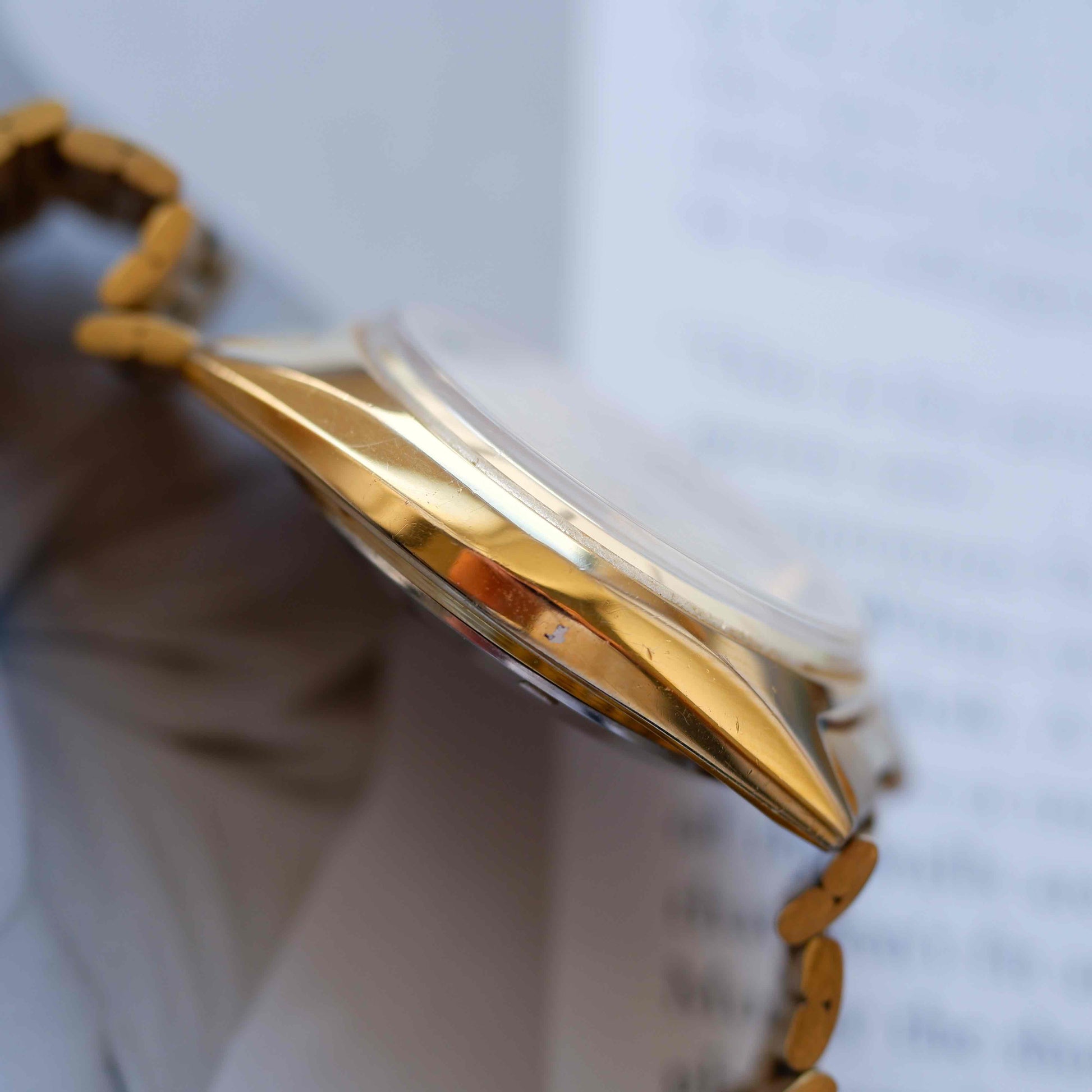 1970s Citizen automatic watch featuring a champagne dial with golden indices, day-date display, and 21-jewel movement. A refined mechanical piece that embodies Citizen’s precision and vintage charm.