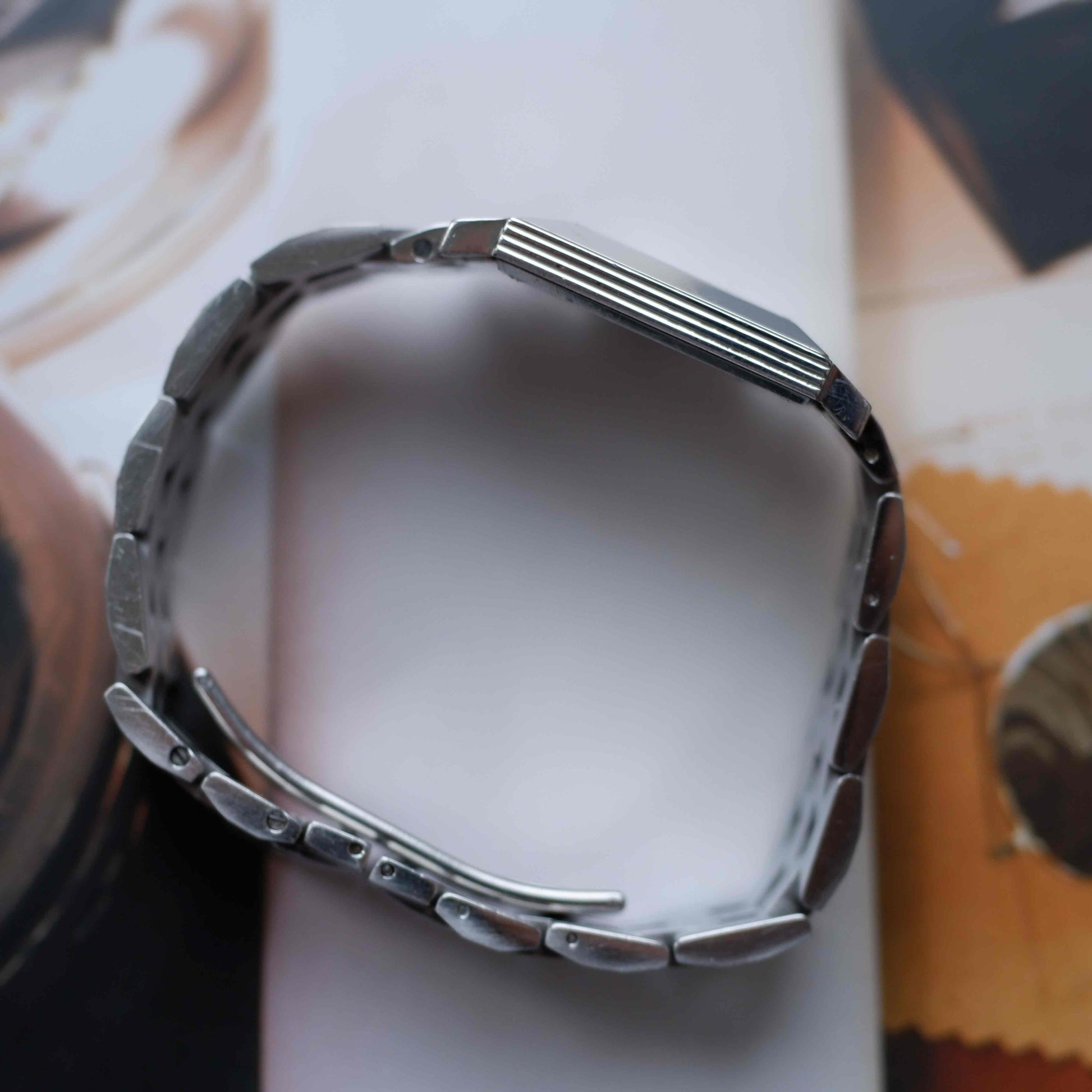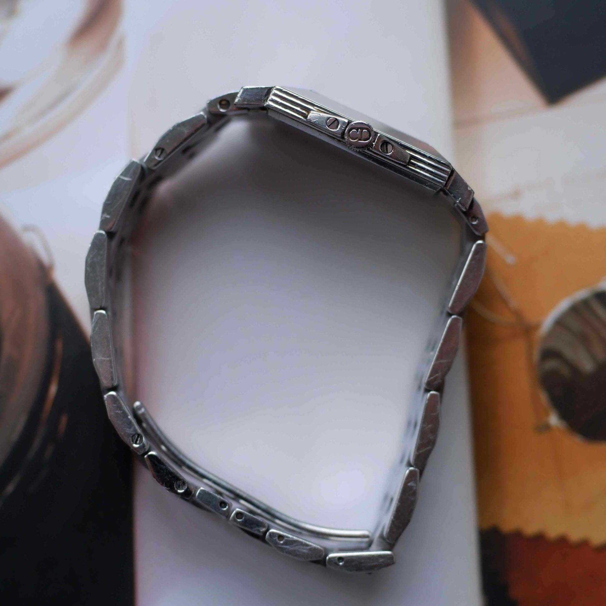 In good vintage condition with no scratches on the crystal. The case and bracelet show light, honest wear consistent with age while retaining strong geometry and original character. Comes complete with its original box and papers — a rare addition for a vintage Dior.