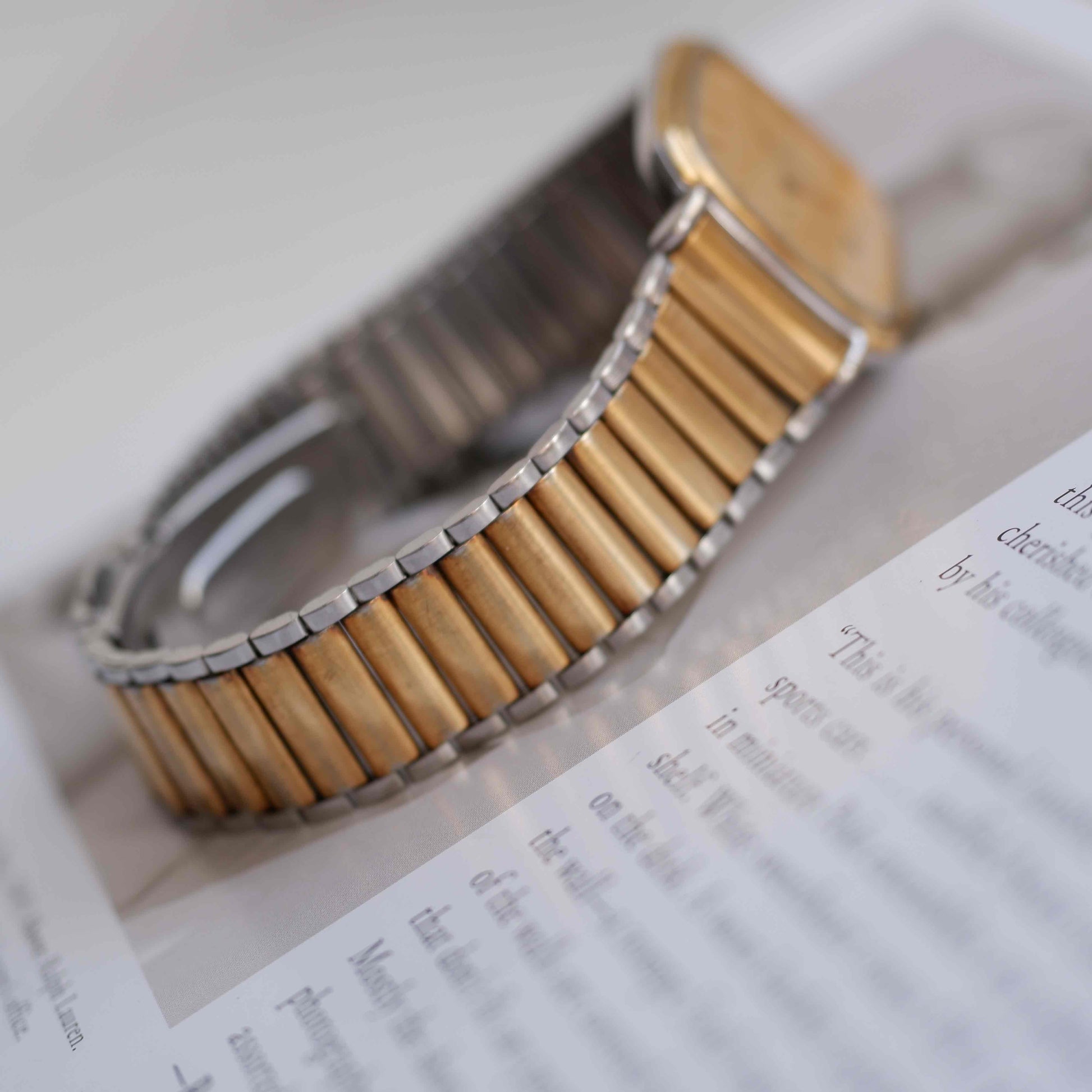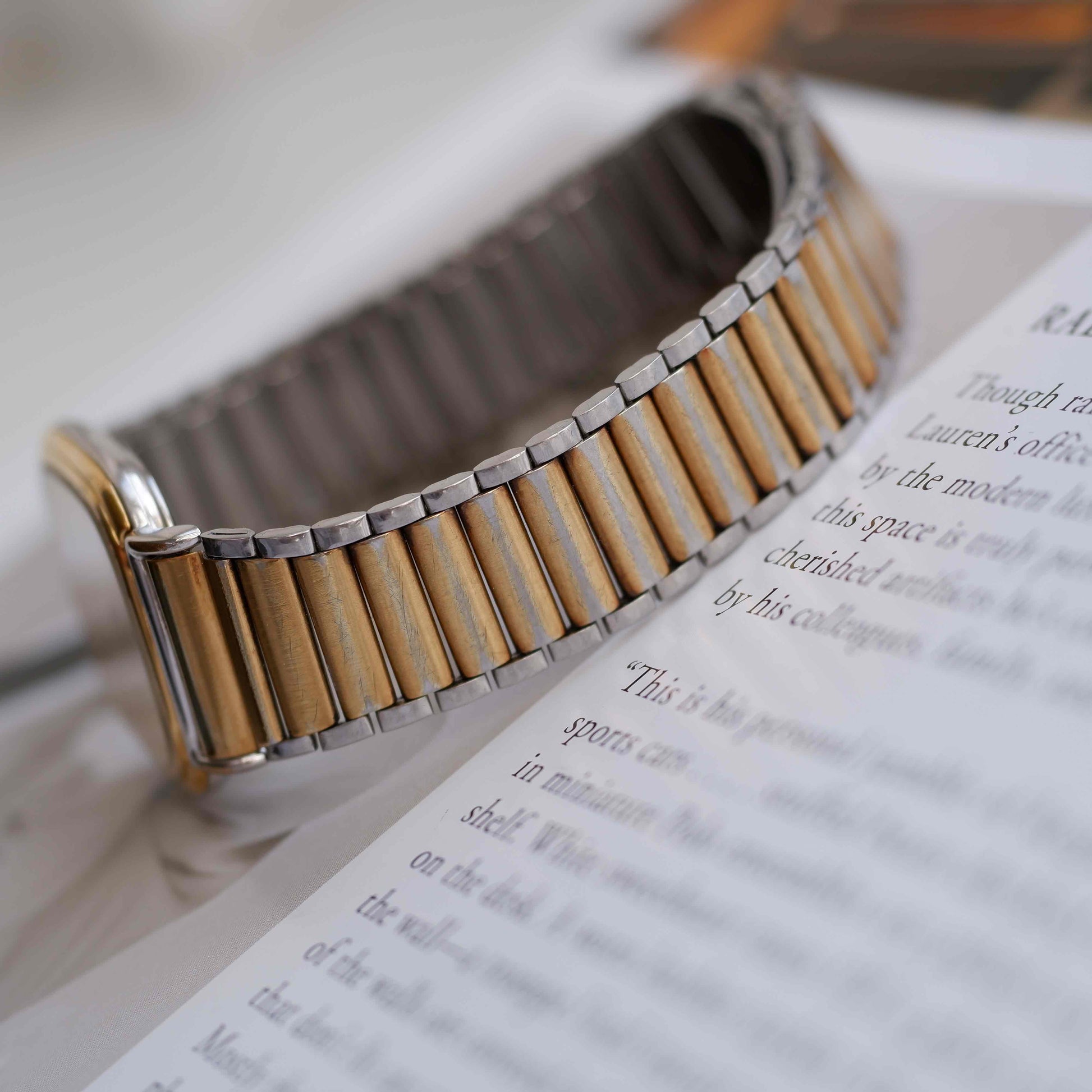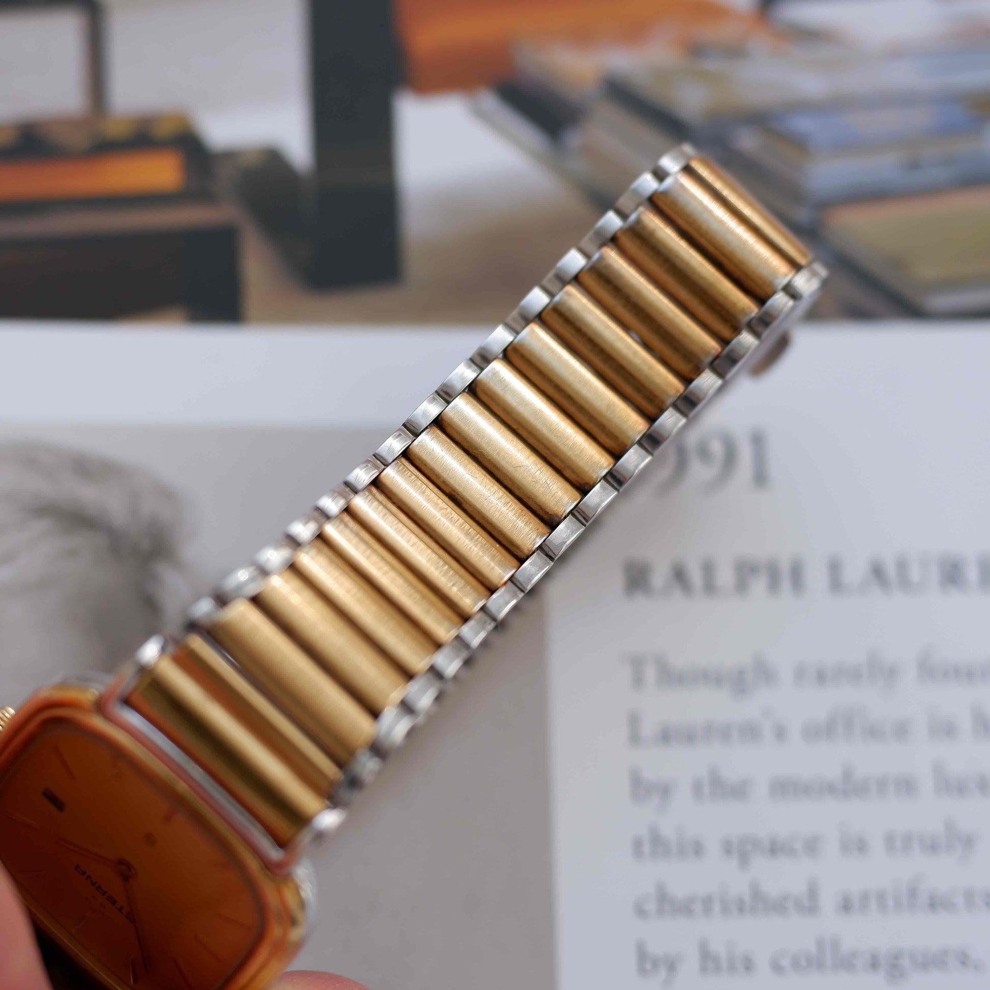 The slim, rounded tank-style case and the soft champagne dial evoke understated luxury, while the two-tone integrated bracelet adds vintage charm. It's powered by a Swiss quartz movement for reliable daily wear. A perfect piece for those who appreciate horological heritage with a touch of golden retro flair.