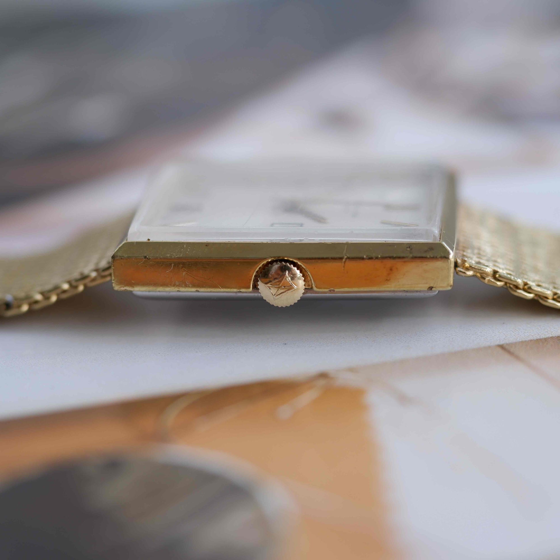 This watch is powered by a reliable hand-wound mechanical movement, housed in a classic rectangular case with a beautiful gold-plated finish. The integrated mesh bracelet offers comfort and style, while the crisp dial with baton indices and date function completes the vintage charm. If you're seeking timeless elegance with real horological heritage — this is the one.