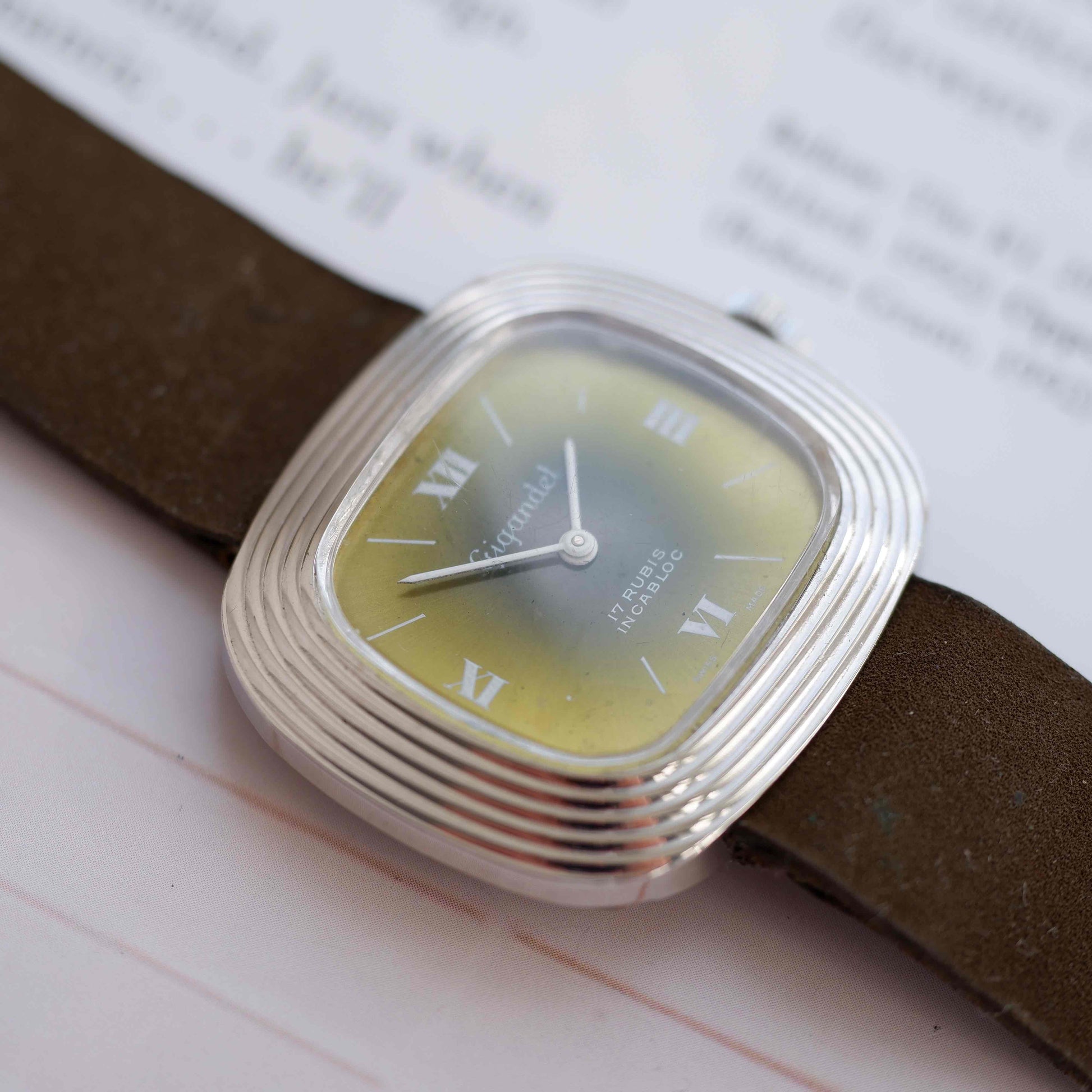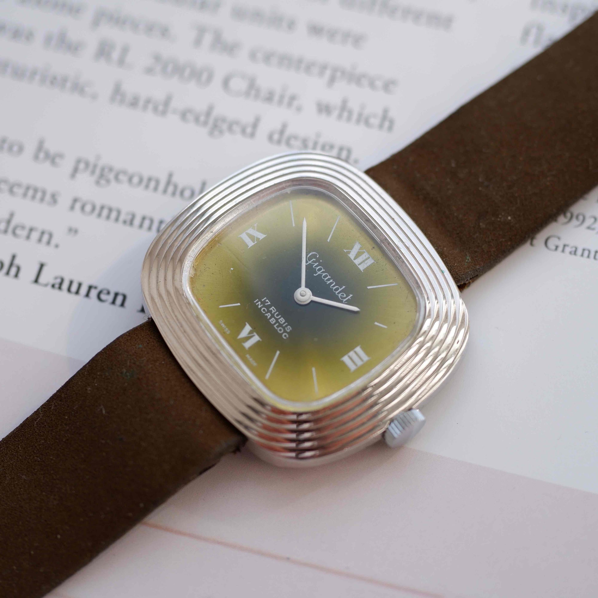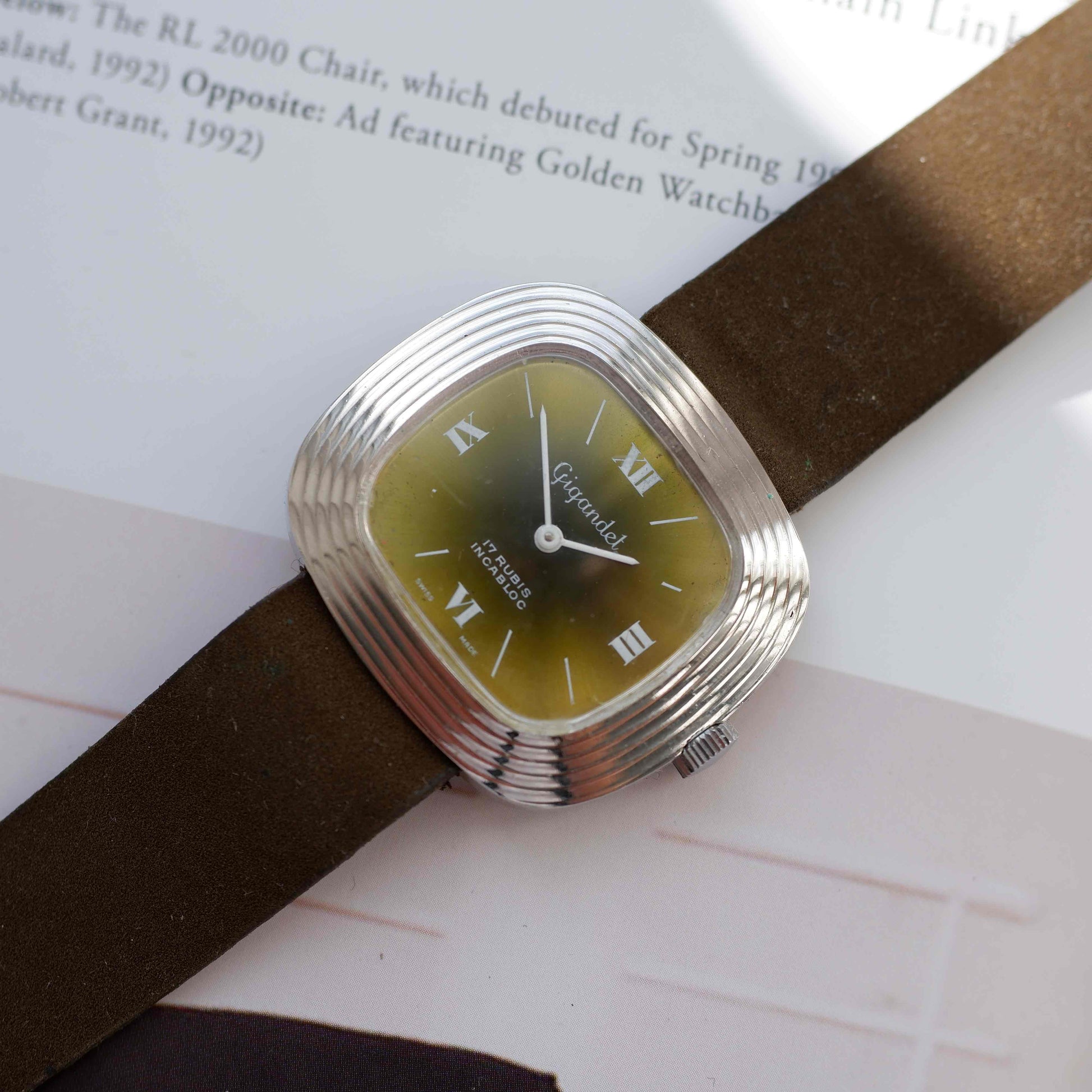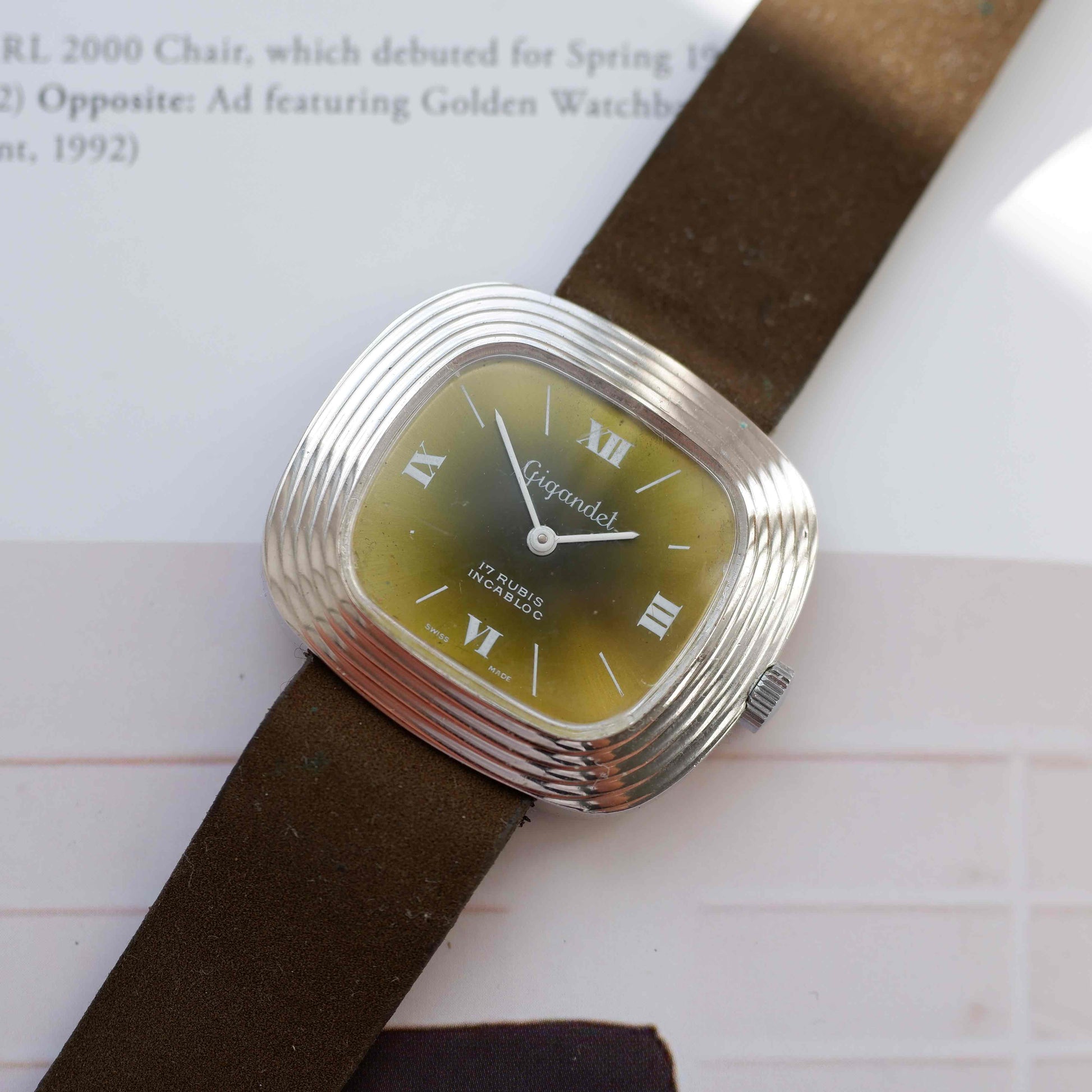 Eye-catching 1970s Gigandet mechanical watch with a rare olive-green Roman dial, TV case, and Swiss-made 17-jewel movement. A bold vintage gem with character.