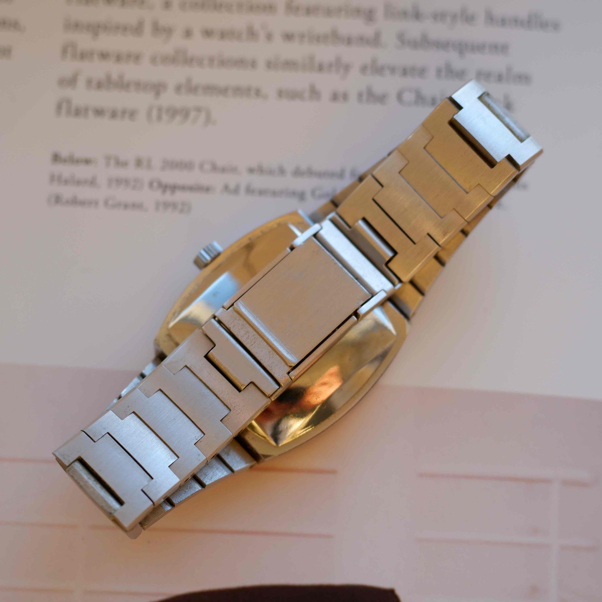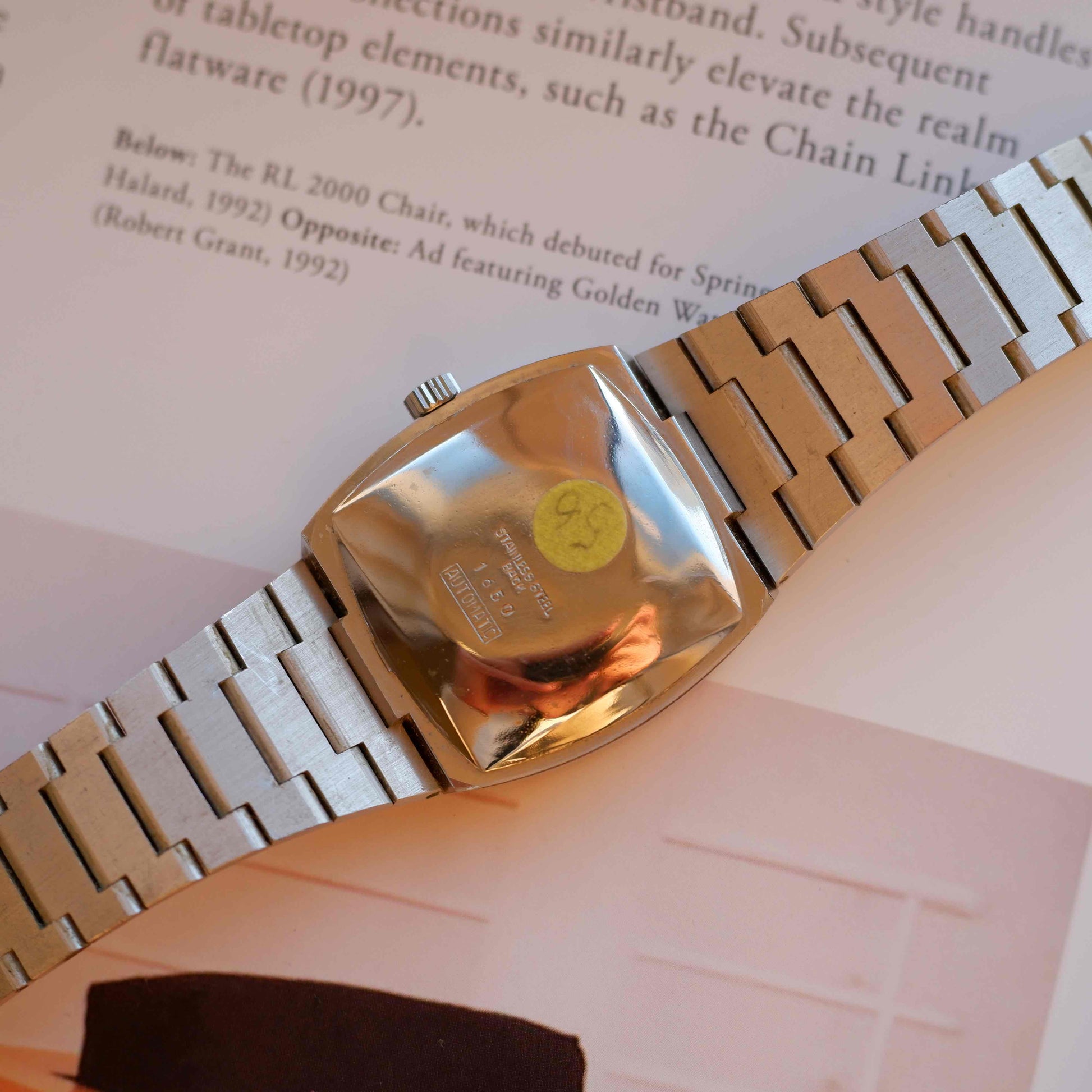 This mint condition Hasler from the 1970s is a striking example of bold Swiss design done right. Its distinctive TV-style stainless steel case and radiant blue sunburst dial feel both retro and refreshingly modern. The watch is powered by a 25-jewel Swiss automatic movement, and its original brushed finish and crisp dial make it a rare find in such well-preserved condition.