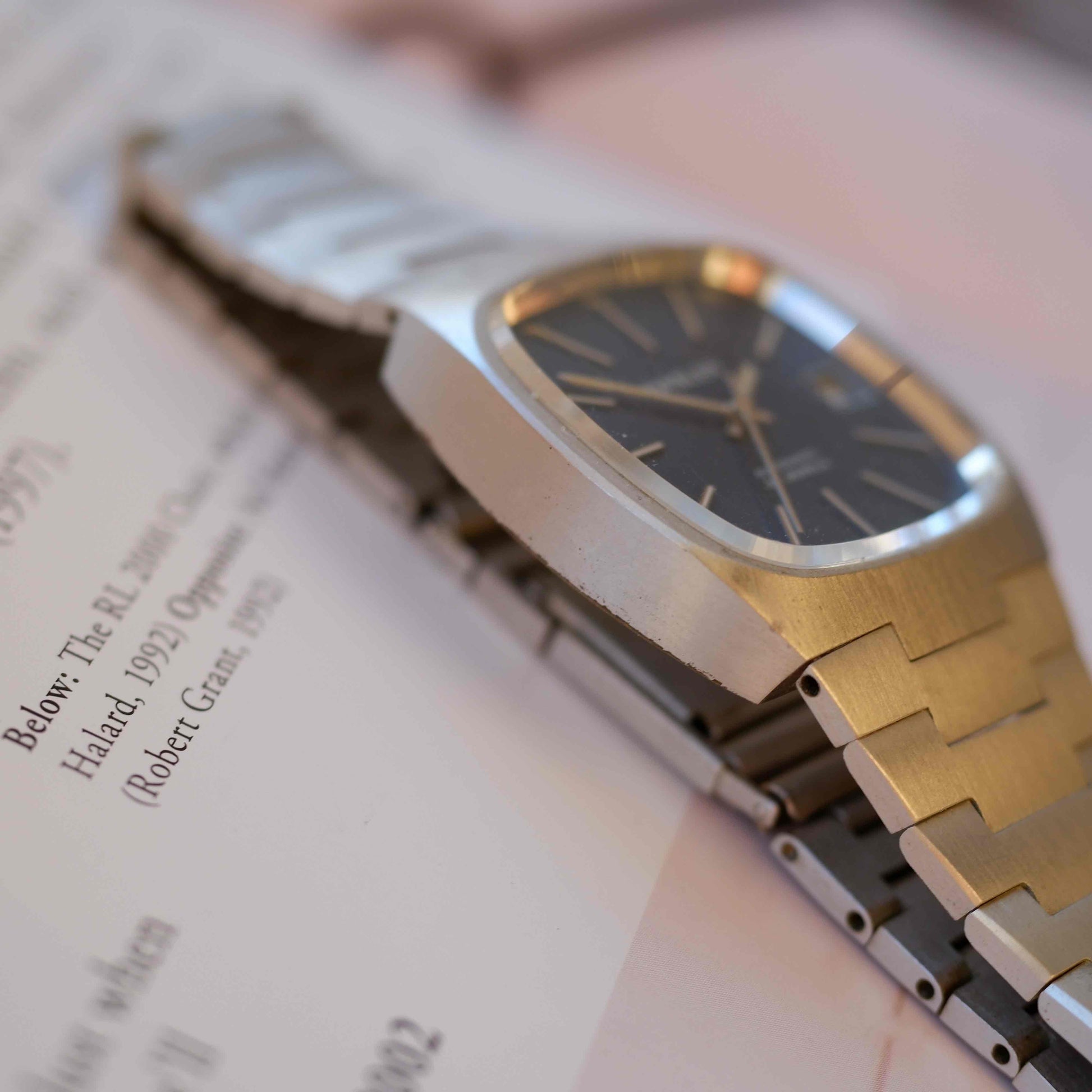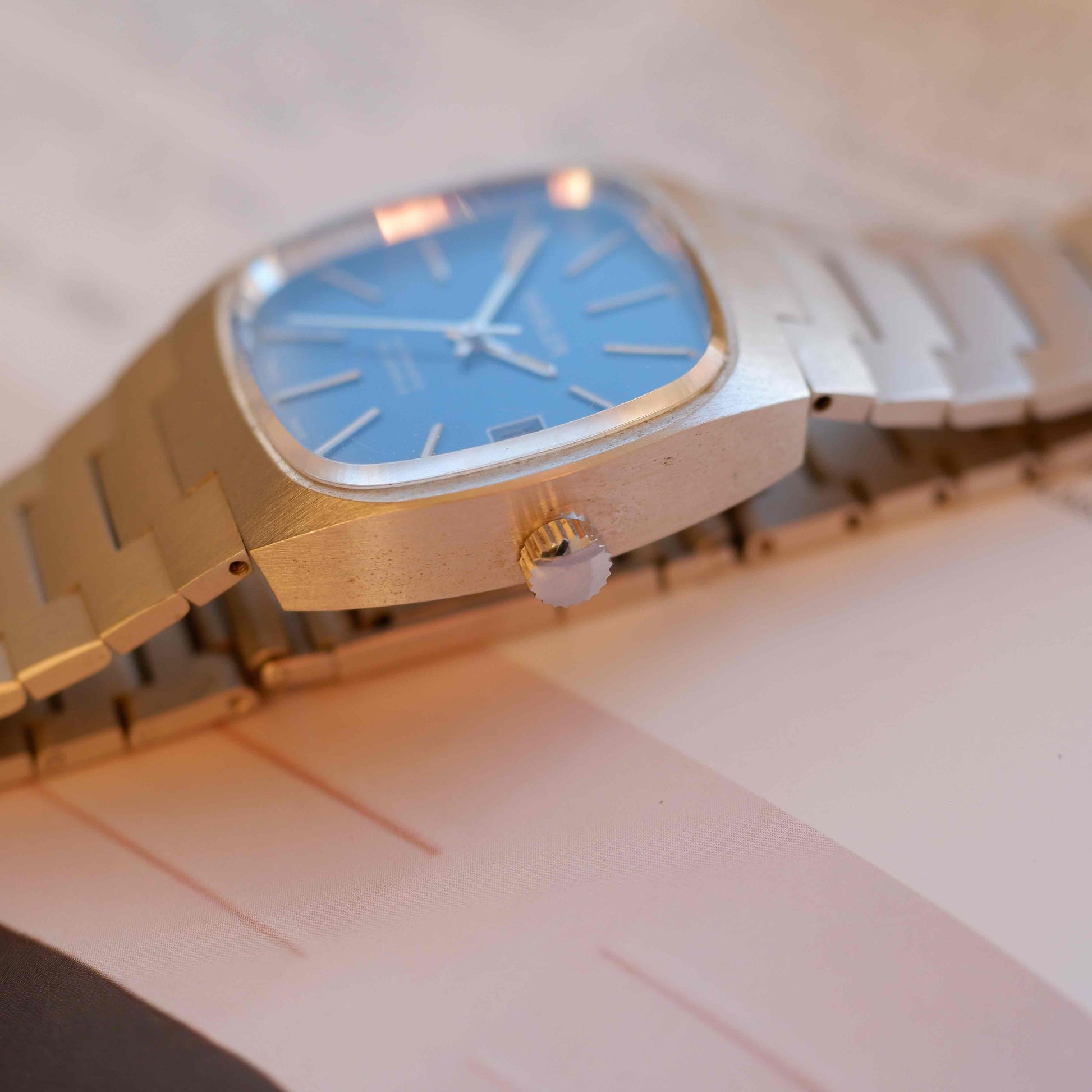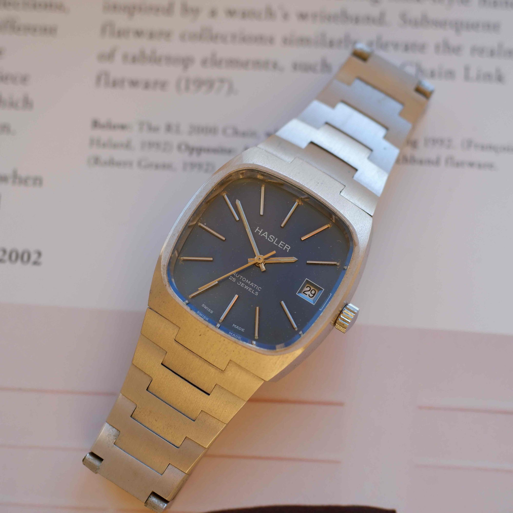 Striking 1970s Hasler with sunburst blue dial, TV-style case, and automatic Swiss movement. A rare design with everyday vintage appeal.