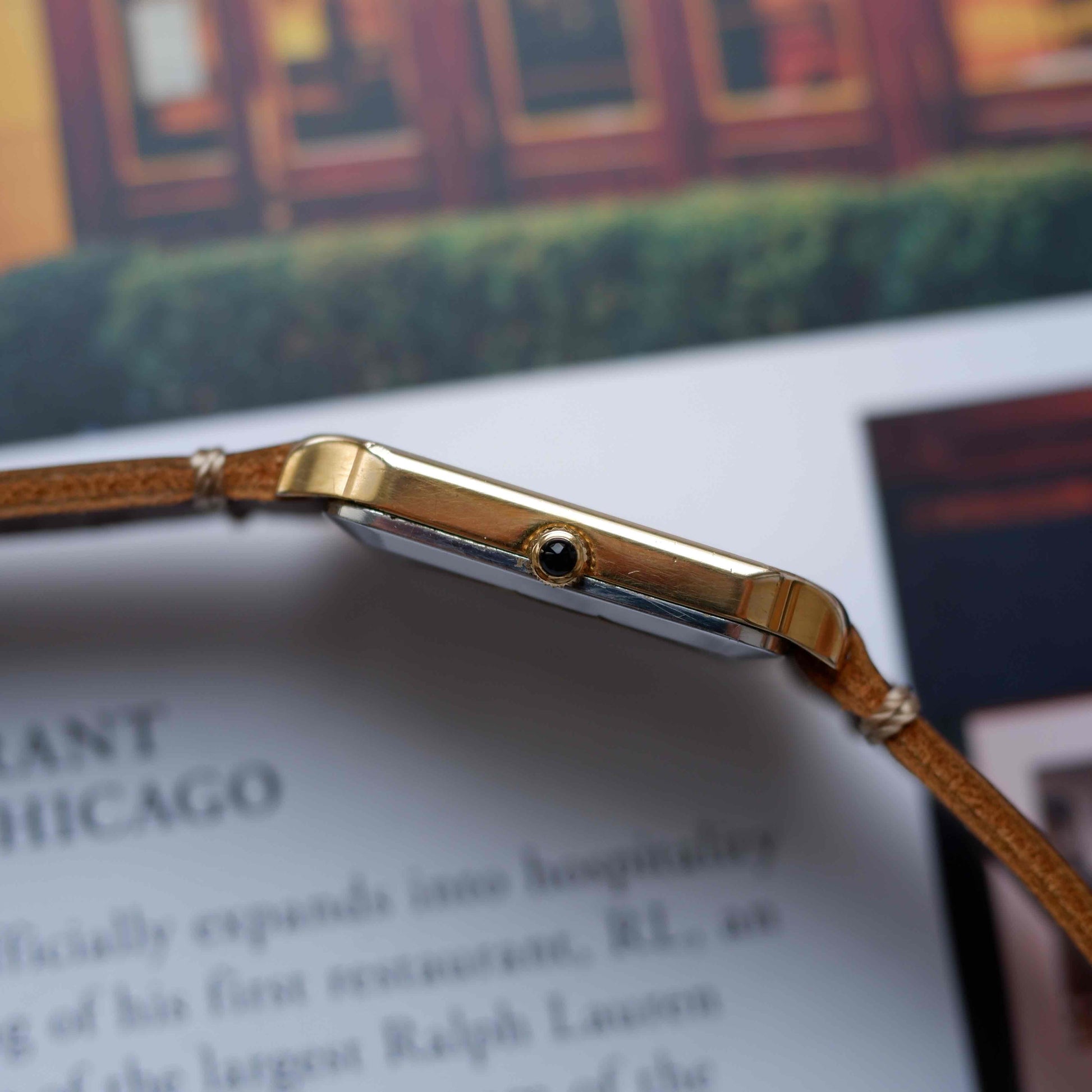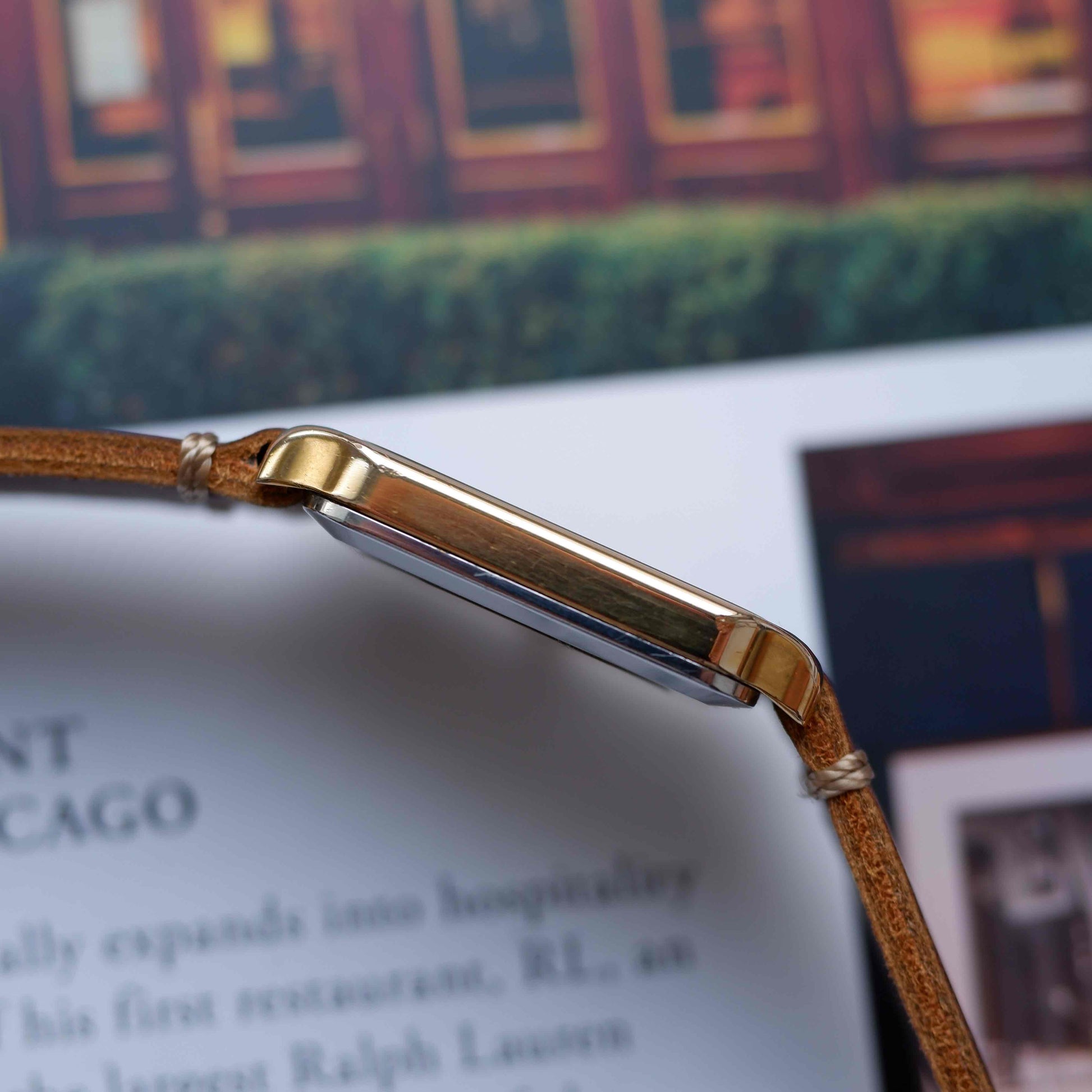 Longines has long been celebrated for its balance of refinement and technical craftsmanship, and this 70s tank is a perfect example. The slender rectangular case with softened angles gives the watch a sophisticated, architectural profile, while the gold linen dial adds a subtle texture that plays beautifully with the light — understated, yet undeniably luxurious.