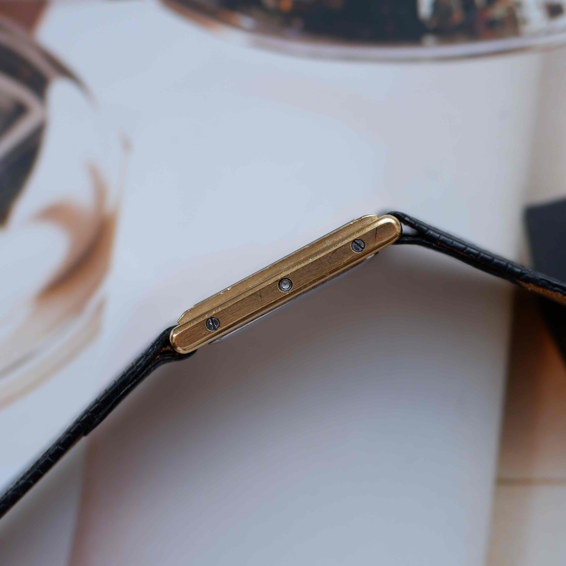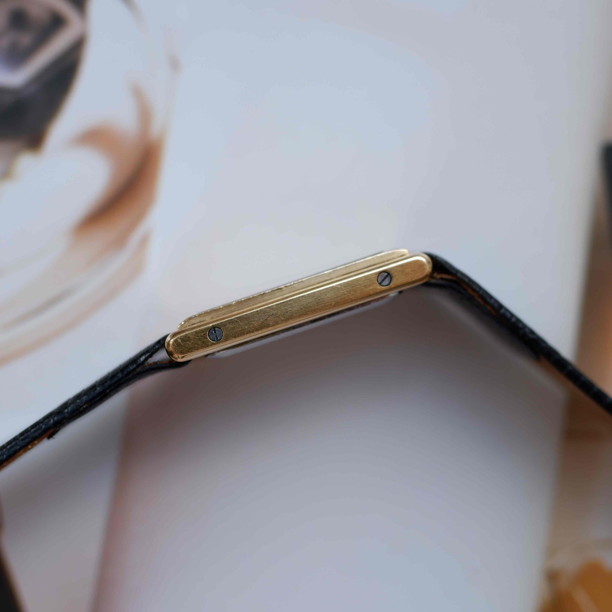 This particular model is a textbook example of that design language. The rectangular case is softly curved and beautifully proportioned, lending a refined silhouette to the wrist. The waffle-textured champagne dial adds depth, while the polished baton indices and dauphine hands keep it clean and legible. Housed in a gold-tone case with an elegant black chapter ring, it captures the warm luxury of the decade.