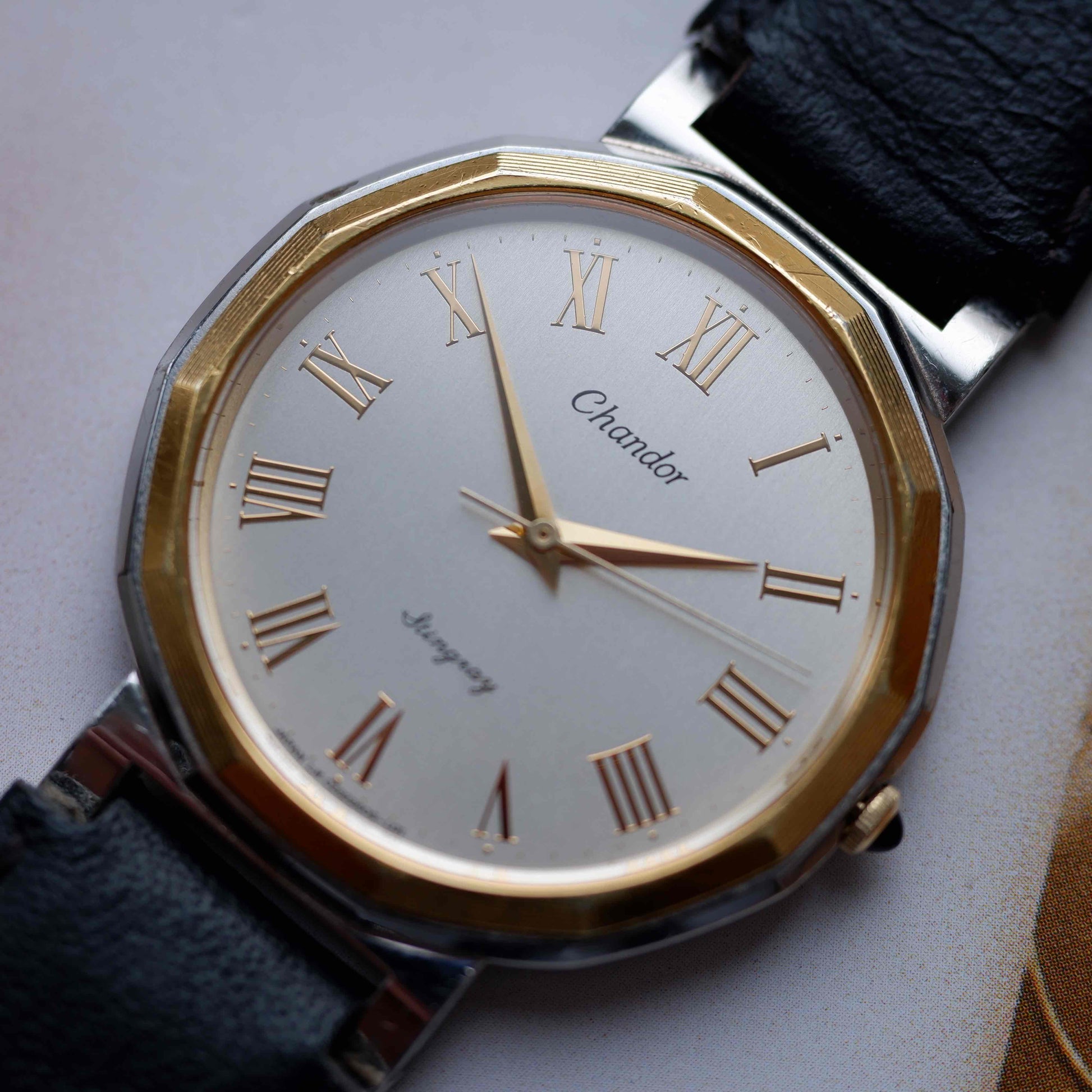 A vintage Chandor (by Orient) quartz dress watch featuring a slim two-tone octagonal case, golden dial with gold Roman numerals, and refined leaf-style hands. A graceful Japanese interpretation of classic European dress design.
