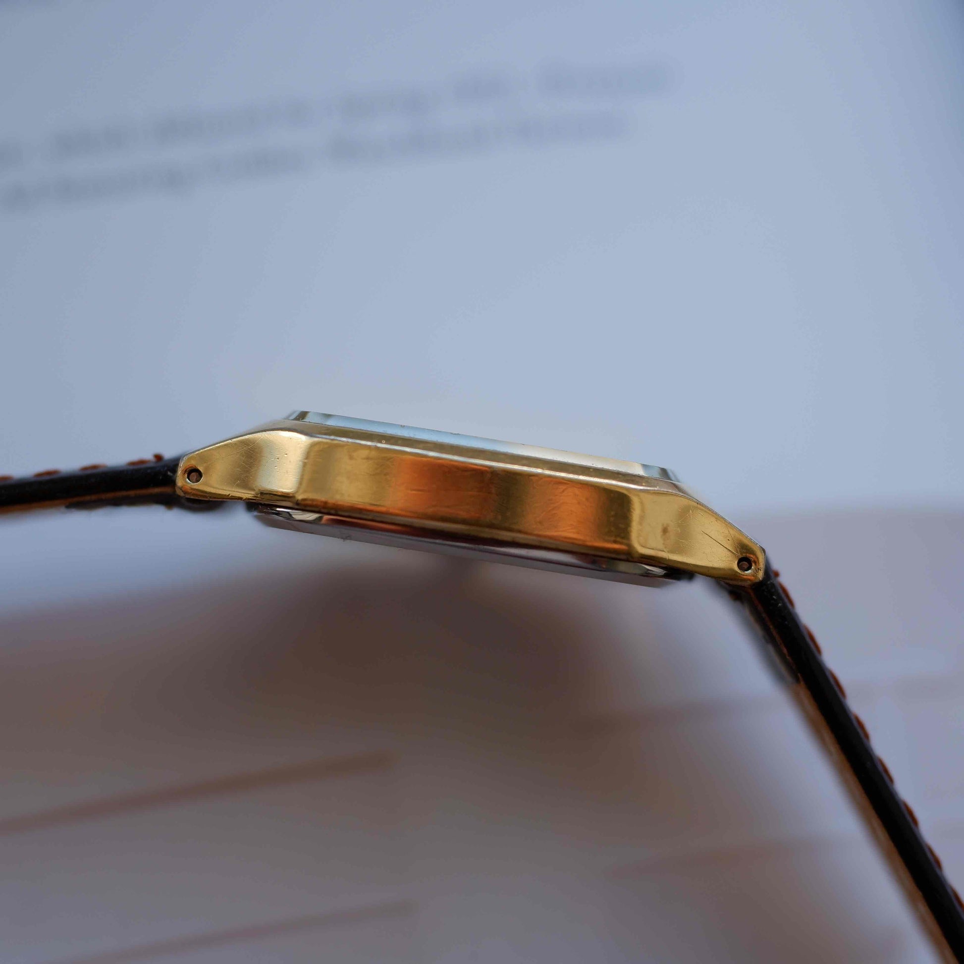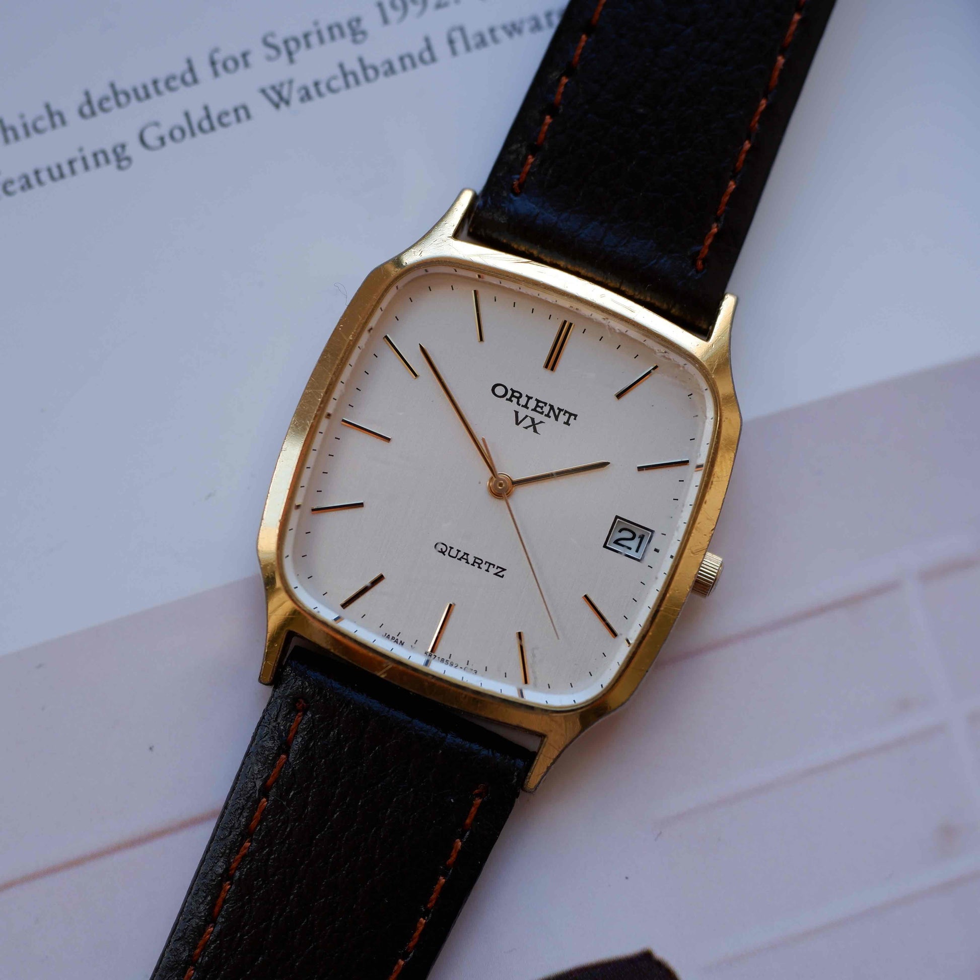 Refined 1980s Orient VX quartz dress watch featuring a slim gold-tone square case, crisp white dial, and minimalist baton indices. Paired with a dark brown leather strap, this elegant timepiece blends Japanese precision with timeless simplicity.