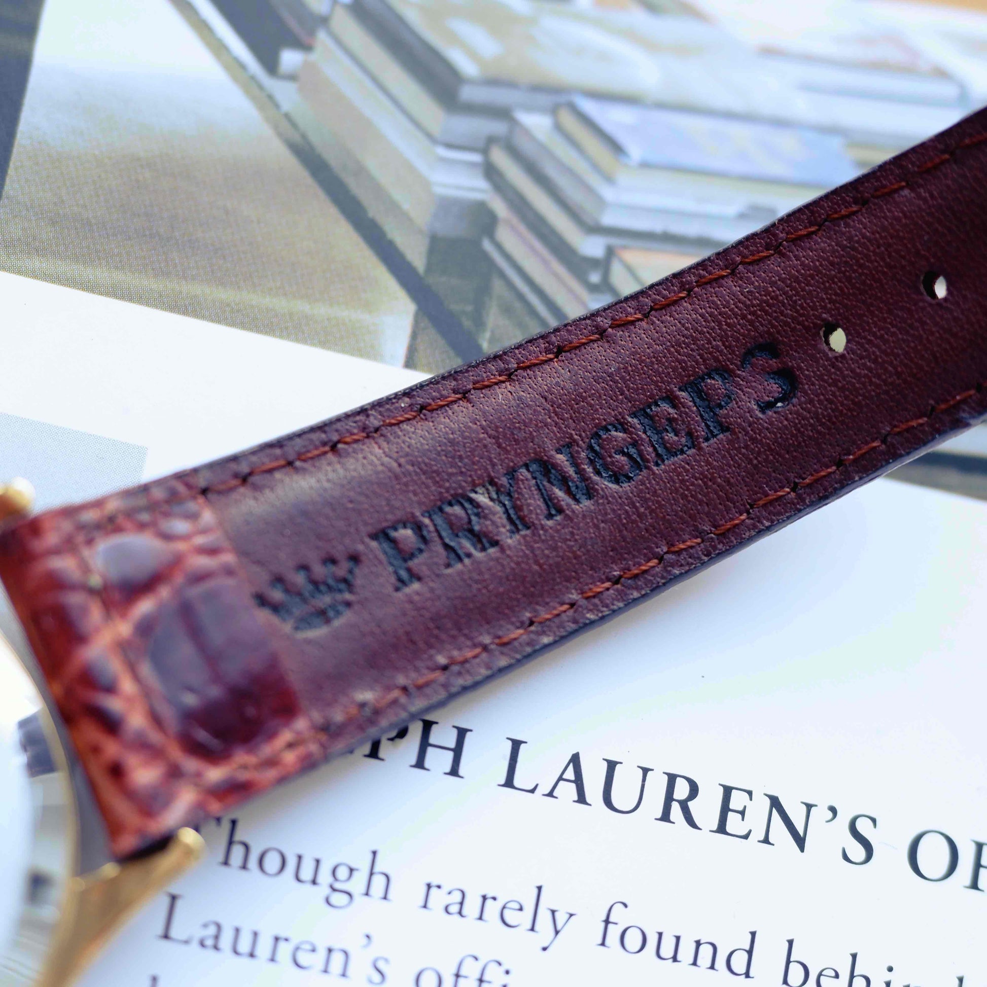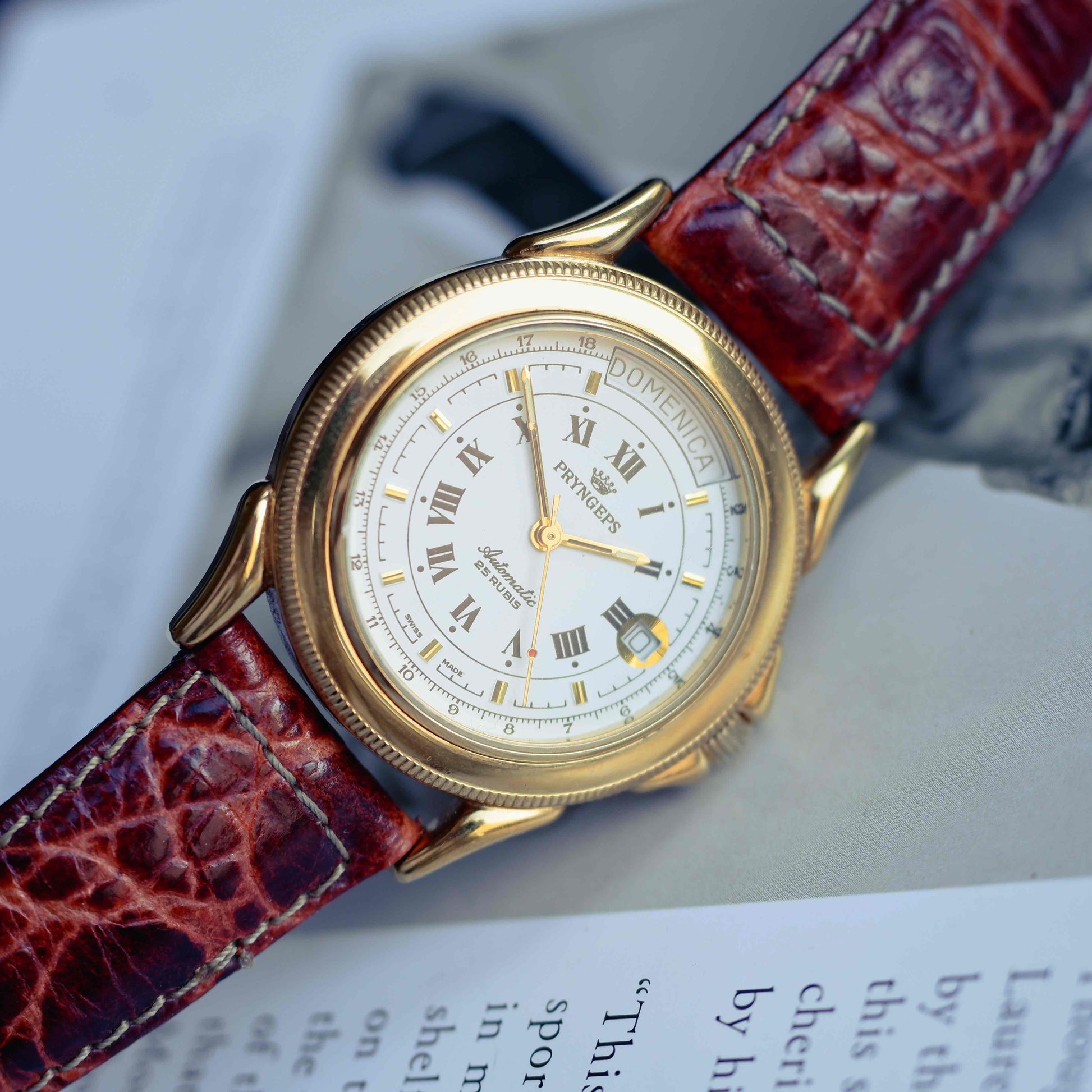 A refined Italian classic, this vintage Pryngeps watch from the 90s features a Roman numeral dial, gold-toned case, and Italian day display—powered by a 25-jewel automatic movement.