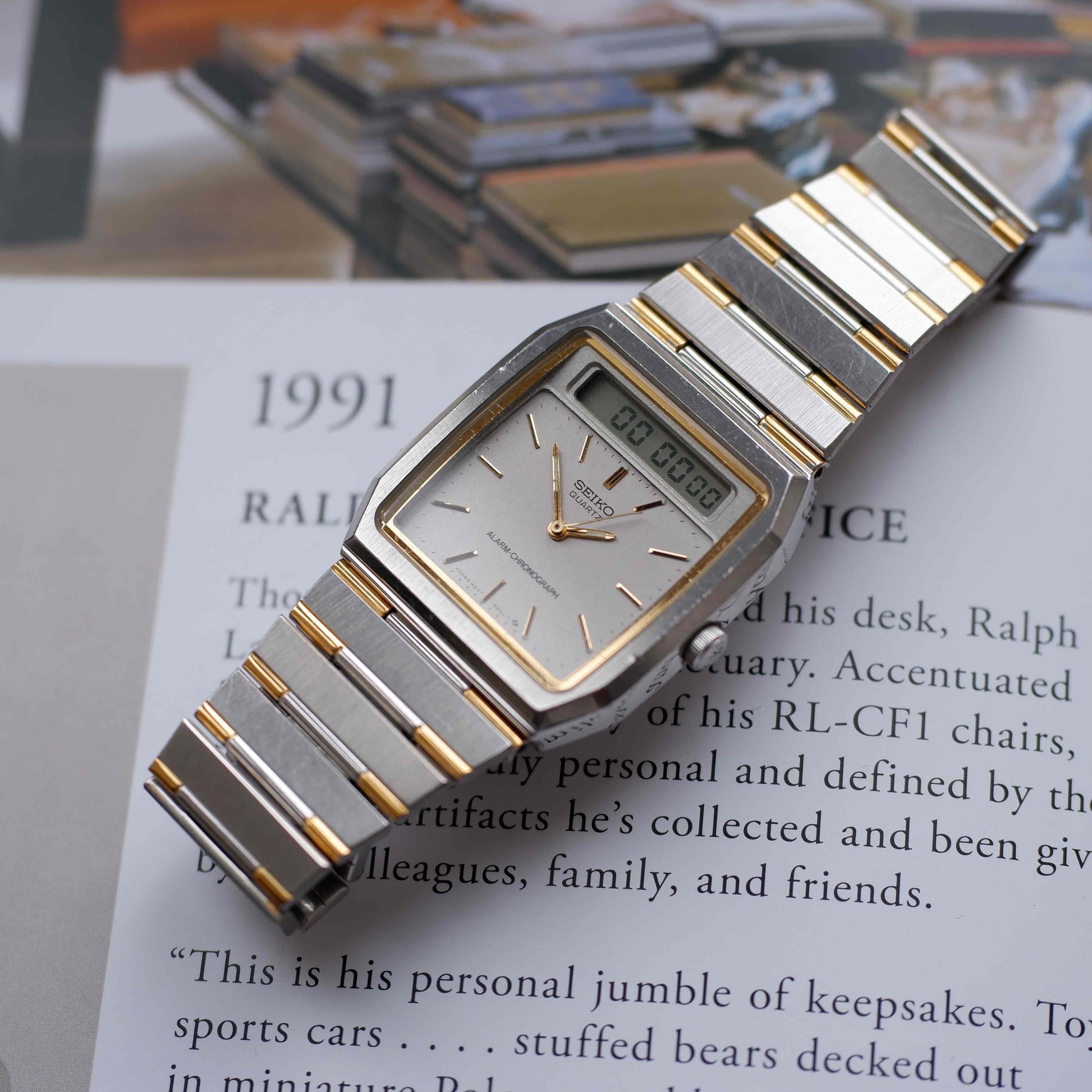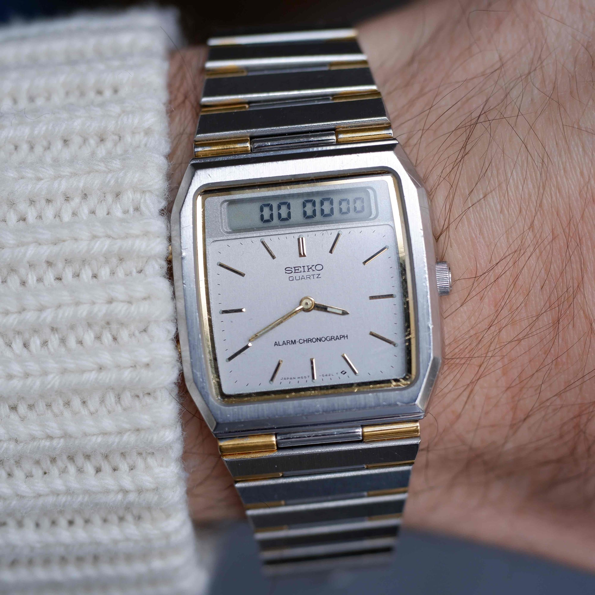 The Vintage Seiko H557-5310 from the 1980s is a two-tone Ana-Digi quartz watch featuring a gold-tone case, analog and digital displays, and multifunction capabilities—blending classic style with innovative technology.