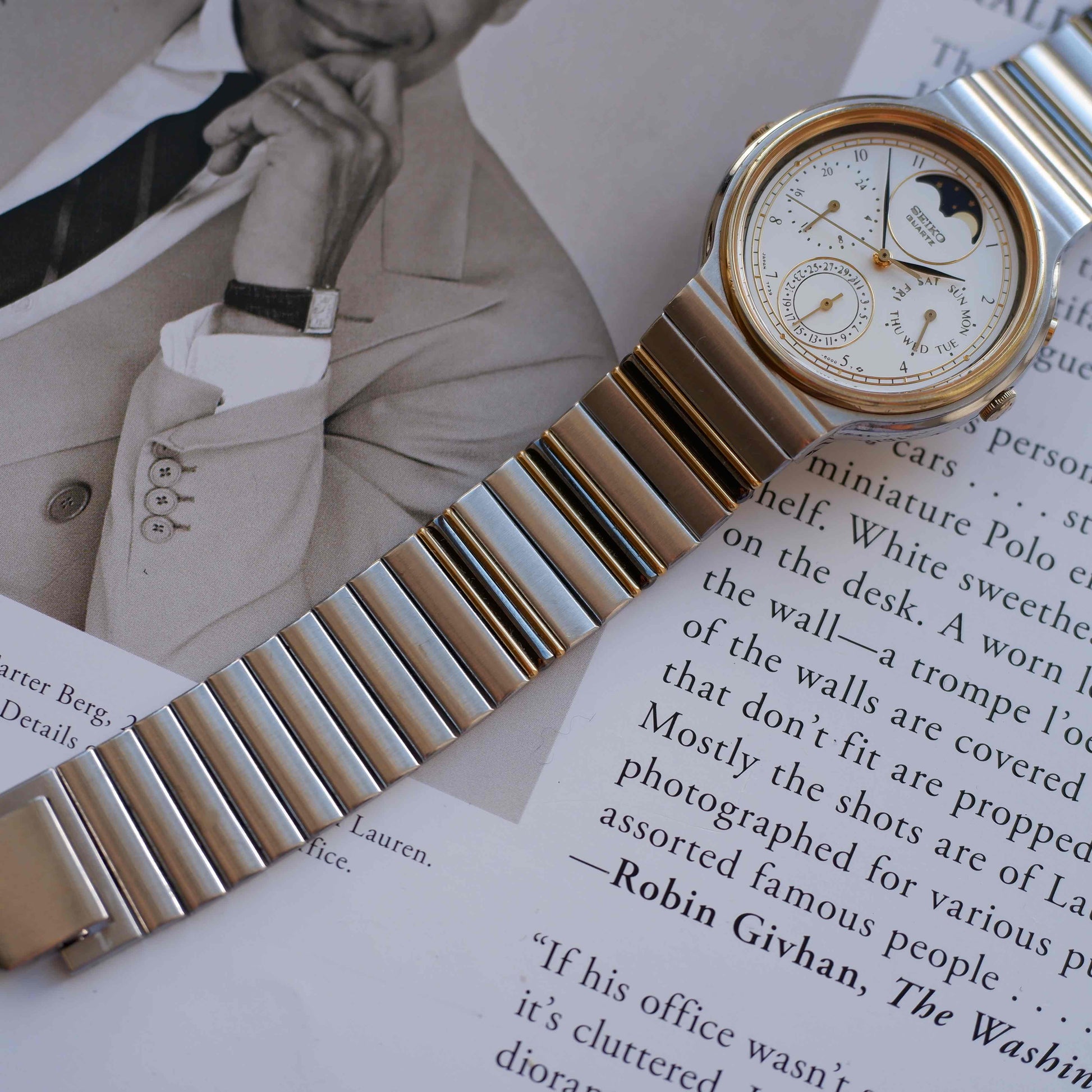 Stunning Moon Phase 1980s Seiko Ref. 7F39-6000 featuring a white dial with moon phase display, day-date subdials, and gold-accented two-tone case and bracelet. Powered by Seiko’s advanced 7F39 quartz movement, it combines precision with poetic design.