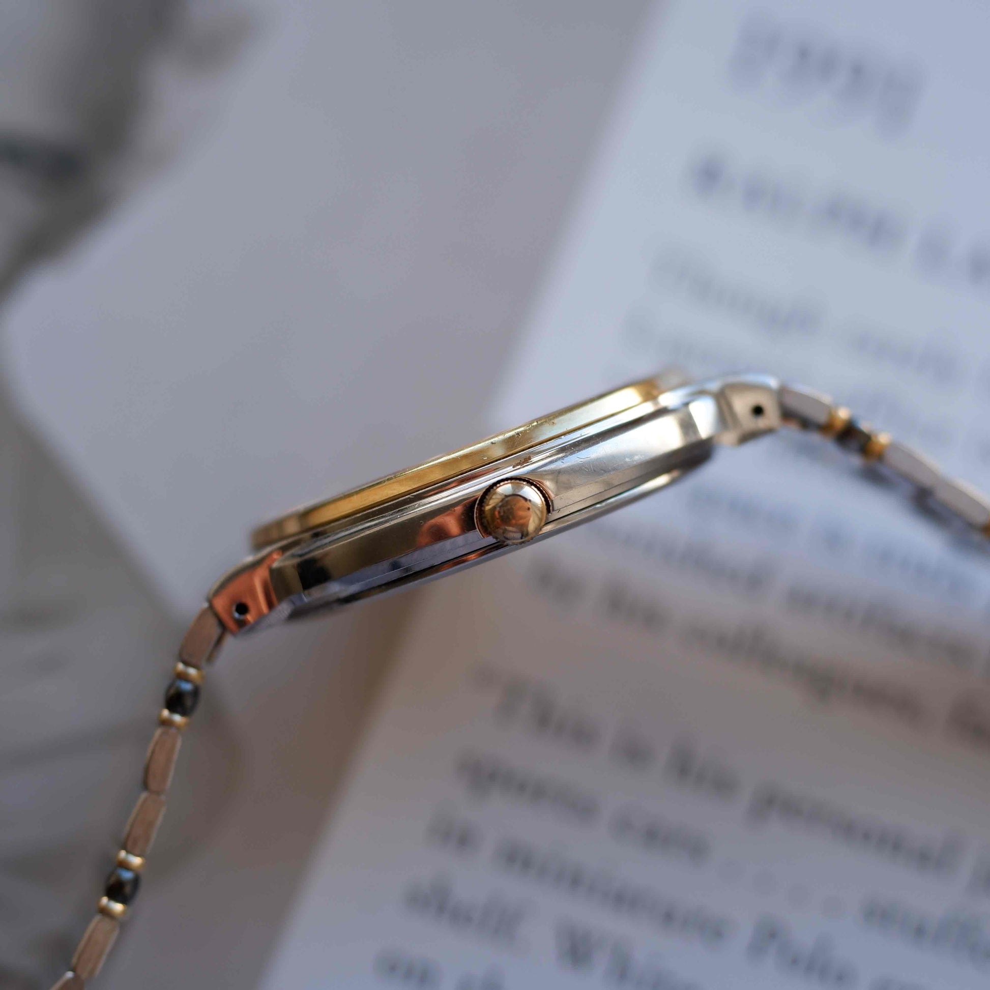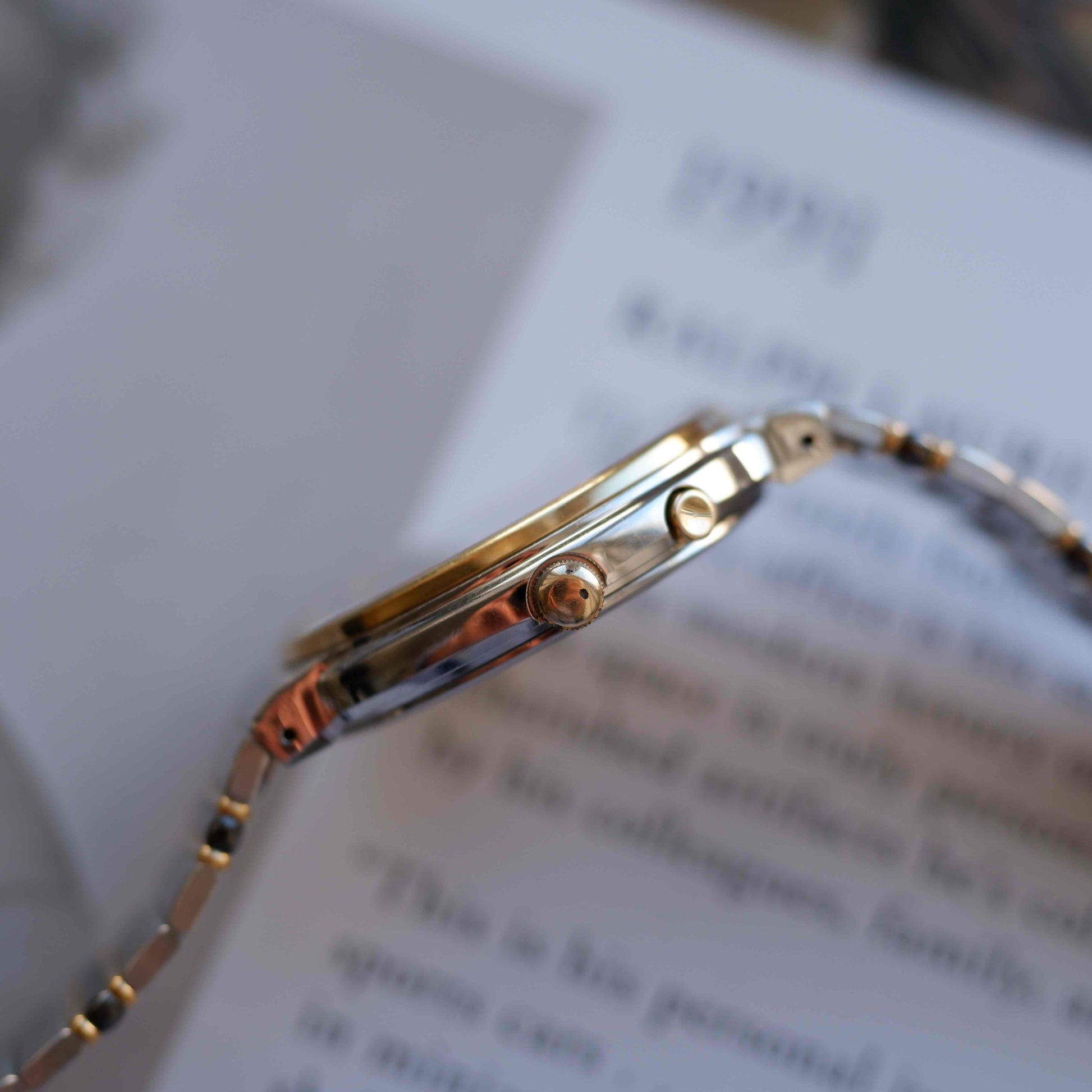 Its slim stainless-steel case with gold accents and integrated bracelet reflects the refined aesthetic of 1980s Japanese design. Inside beats Seiko’s highly accurate 7F39 quartz caliber, celebrated for its reliability and long battery life. A unique balance of functionality, charm, and quiet sophistication — perfect for those who appreciate Seiko’s more poetic side.