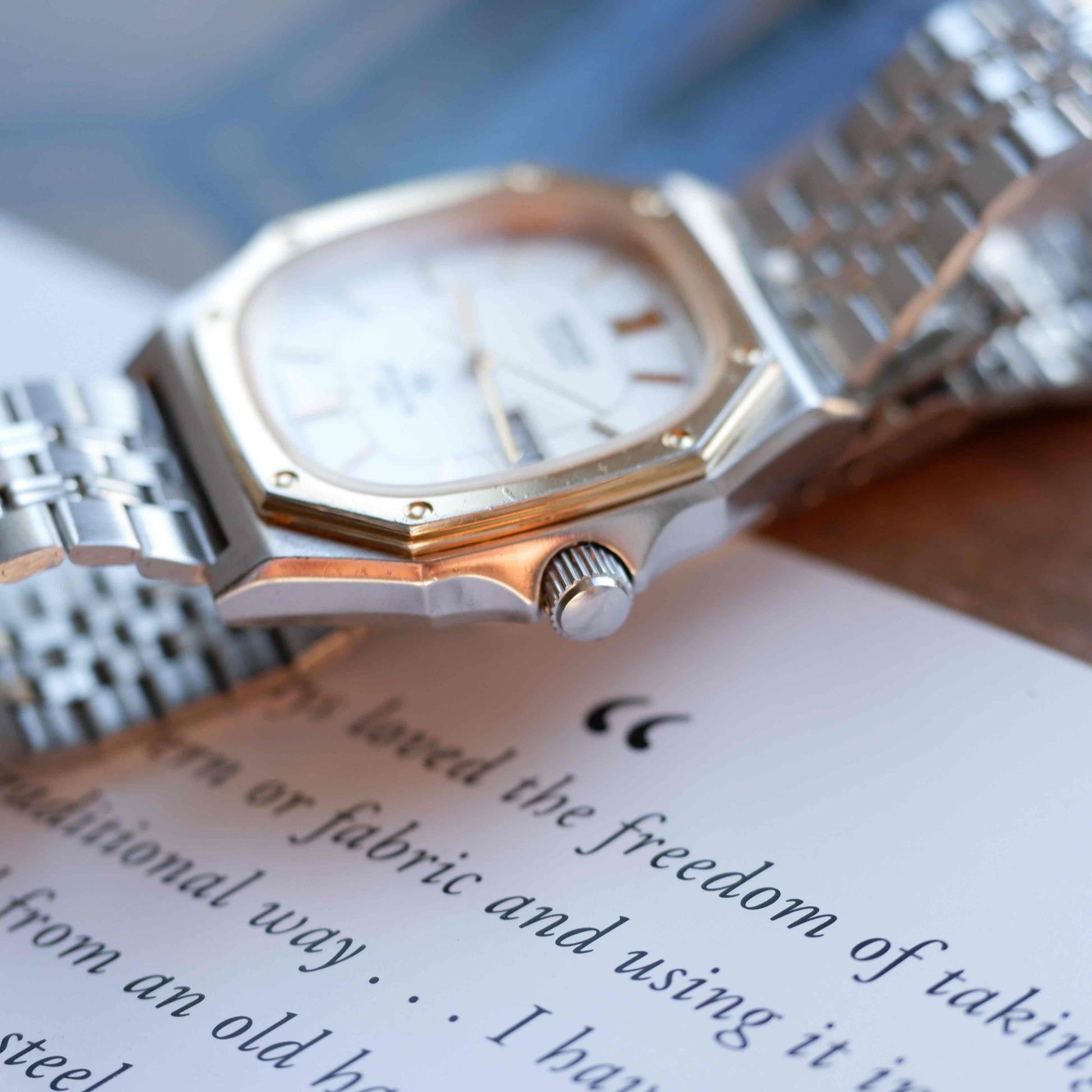 A bold Seiko Sports Quartz from the 1980s featuring a distinctive two-tone octagonal case, crisp white dial, and day-date complication—Japanese-built and full of character.