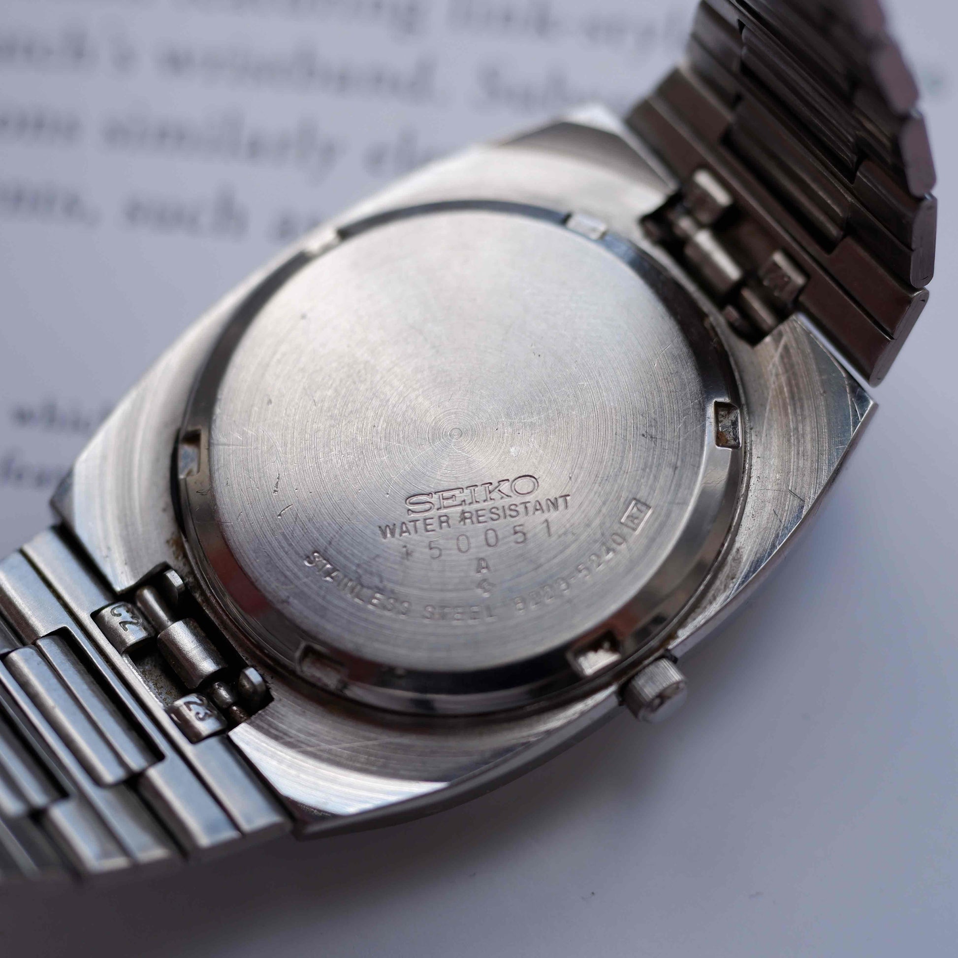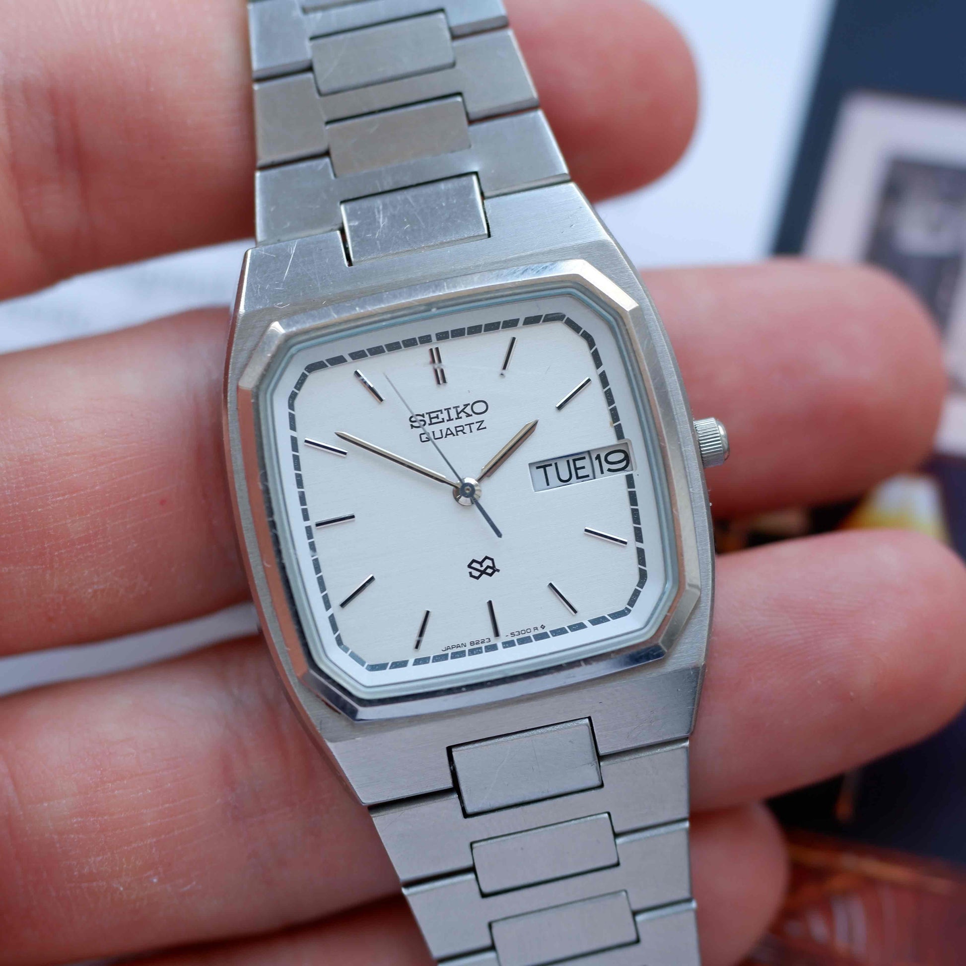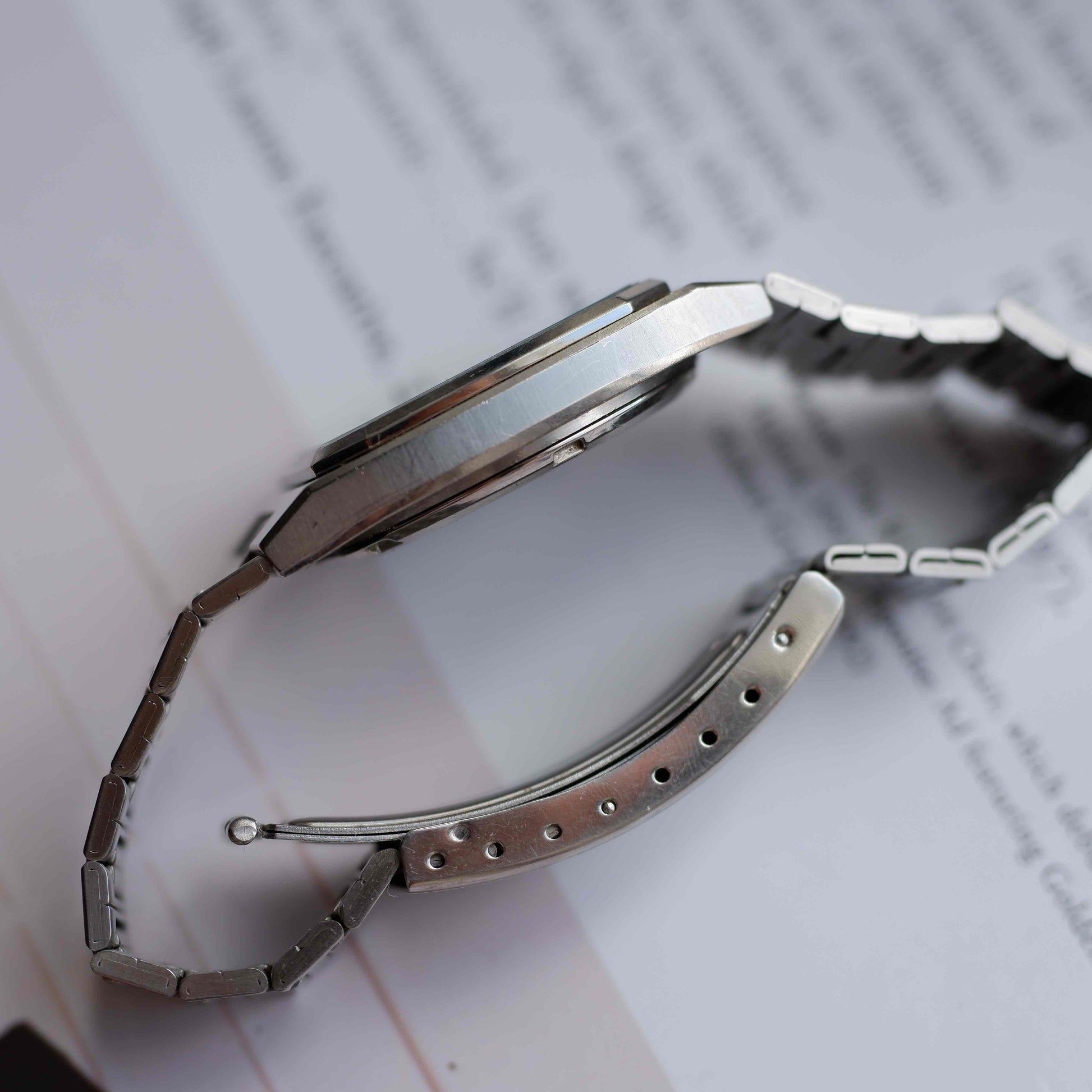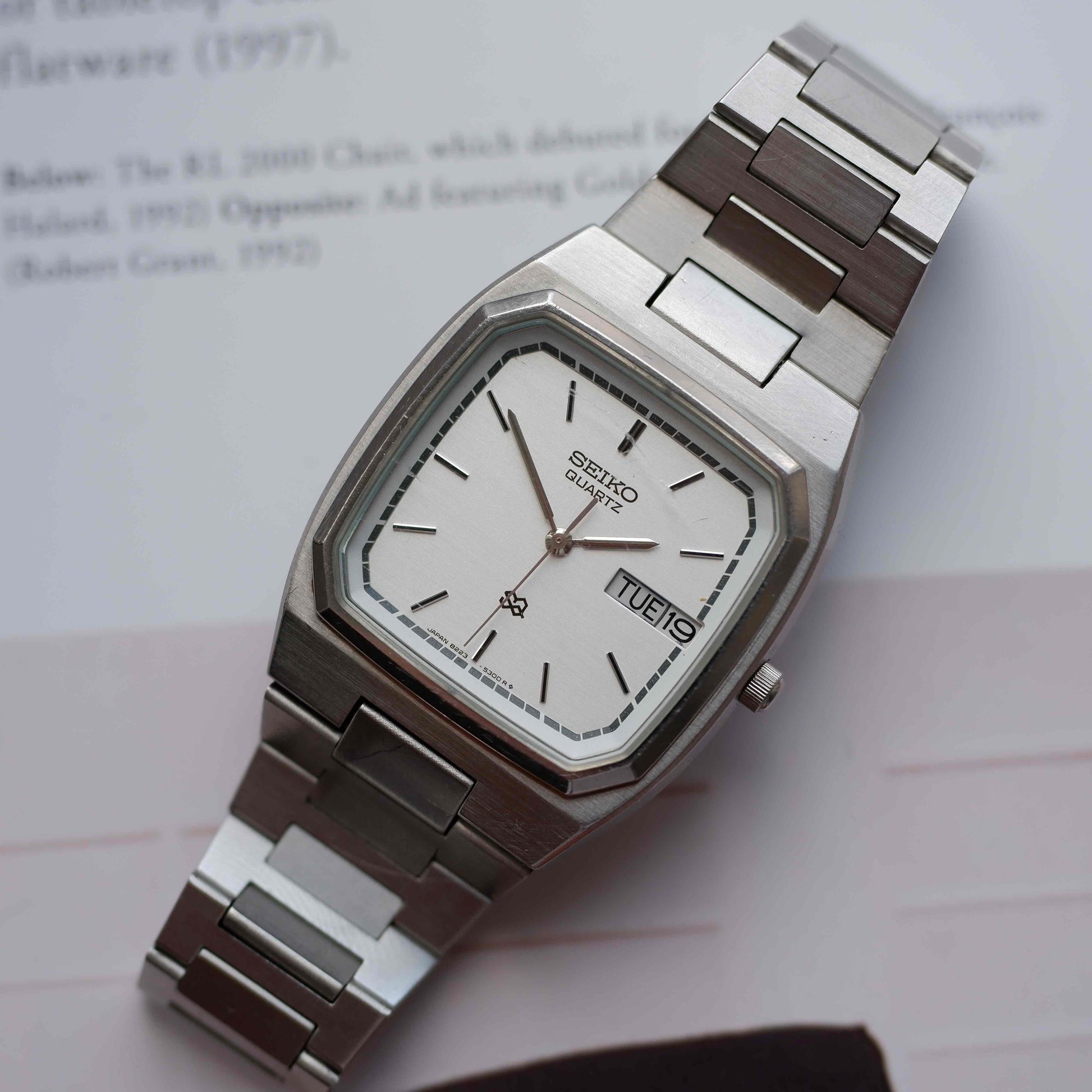 This Seiko brings together the best of 1980s design—geometric, elegant, and effortlessly wearable. The clean white dial with slender black indices and hands is easy to read, while the angular case and integrated bracelet give it a bold architectural look.