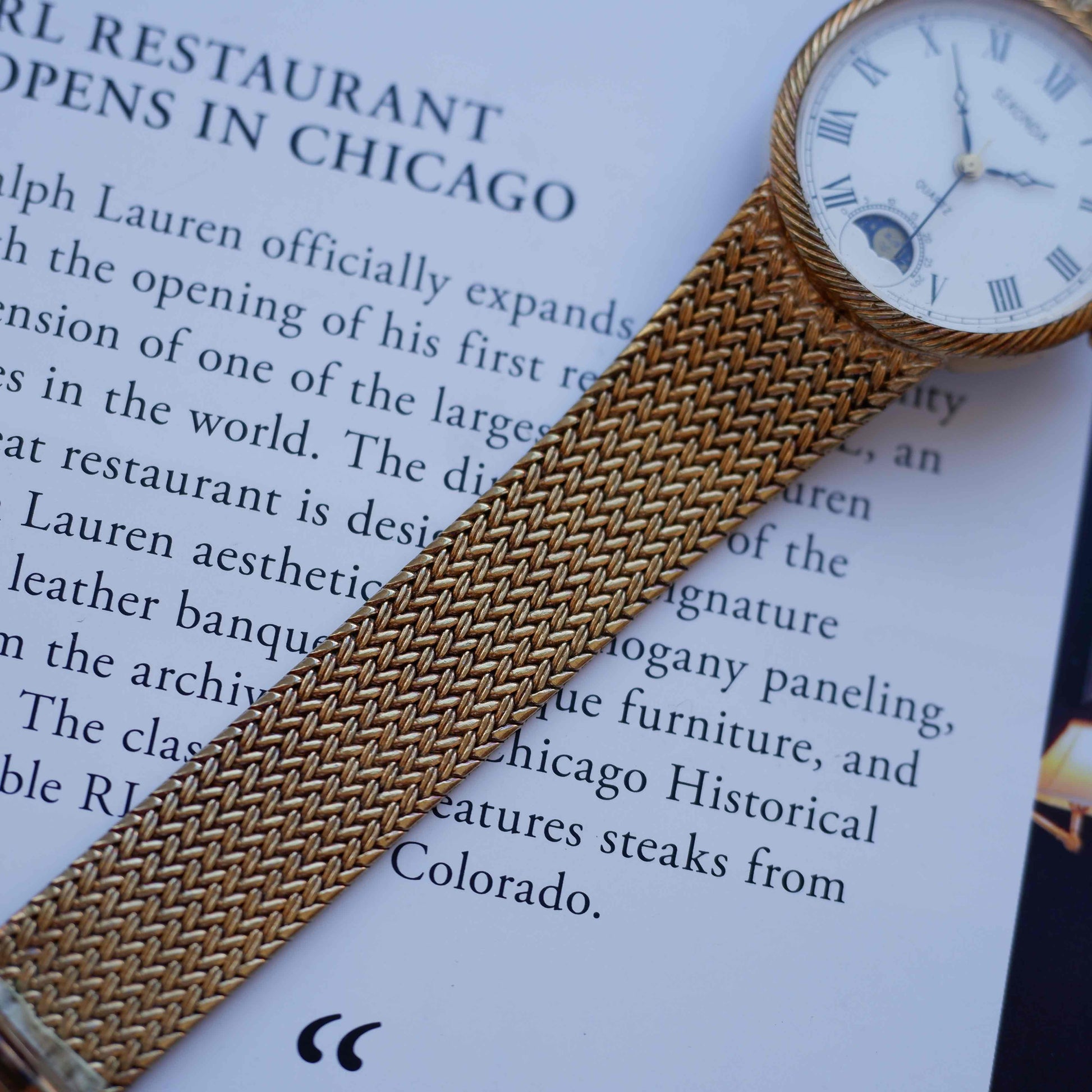 1980s Sekonda quartz watch featuring a white Roman numeral dial, moon phase display, and gold-tone case with a woven bracelet. A refined blend of classic European design and 80s-era charm.