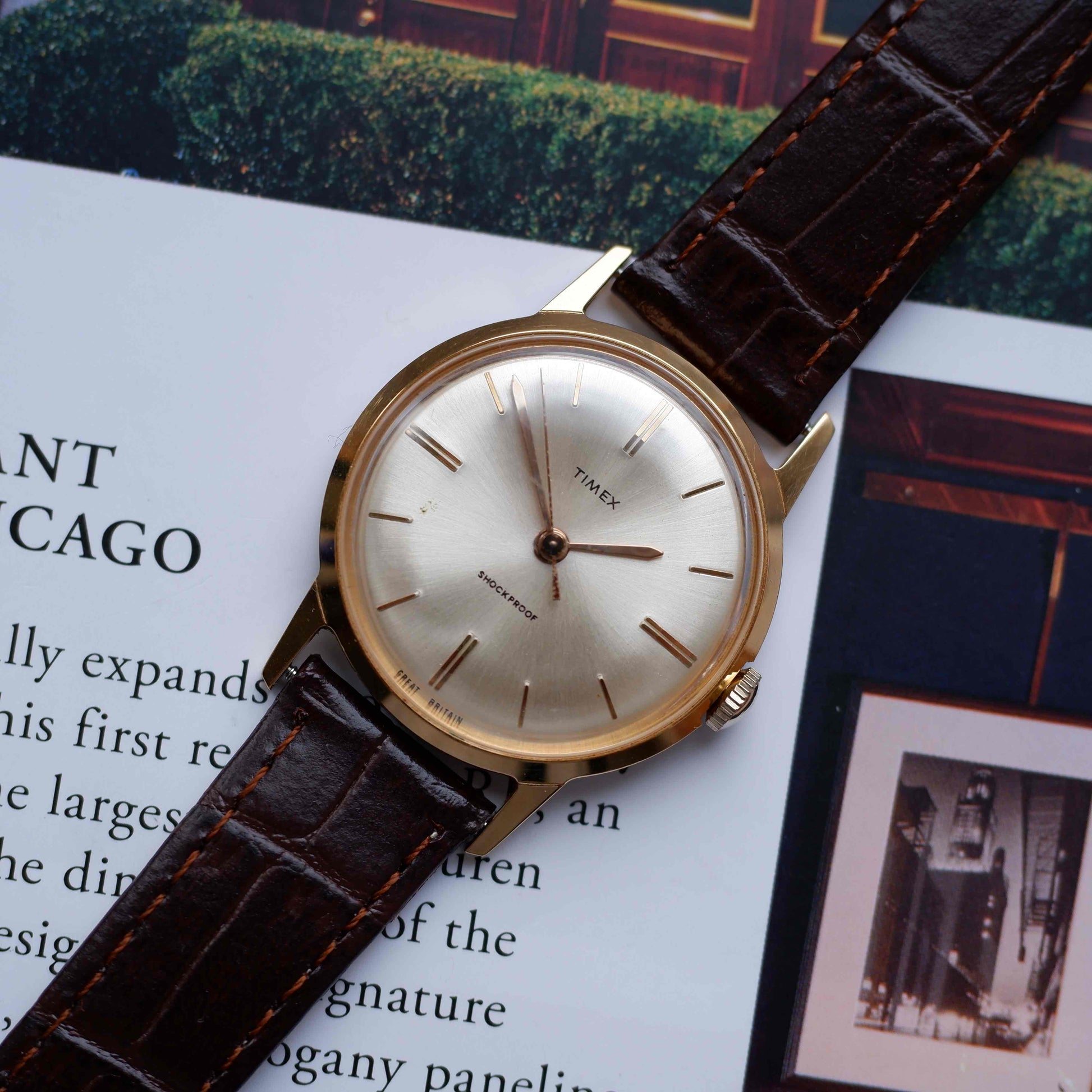 A vintage 1960s Timex Shockproof with a clean silver sunburst dial, golden case, and minimalist baton markers. A classic British-made Timex with timeless mid-century charm.