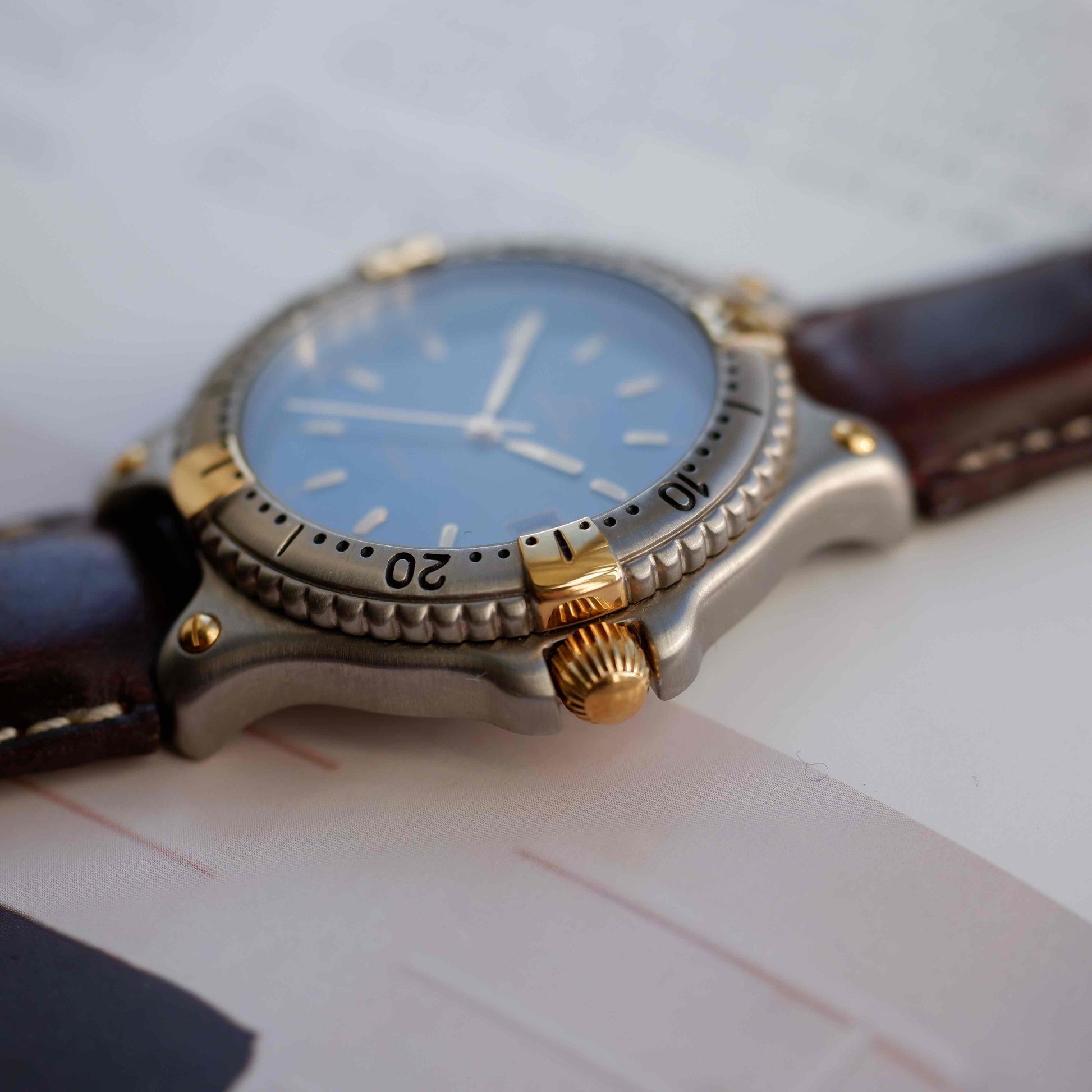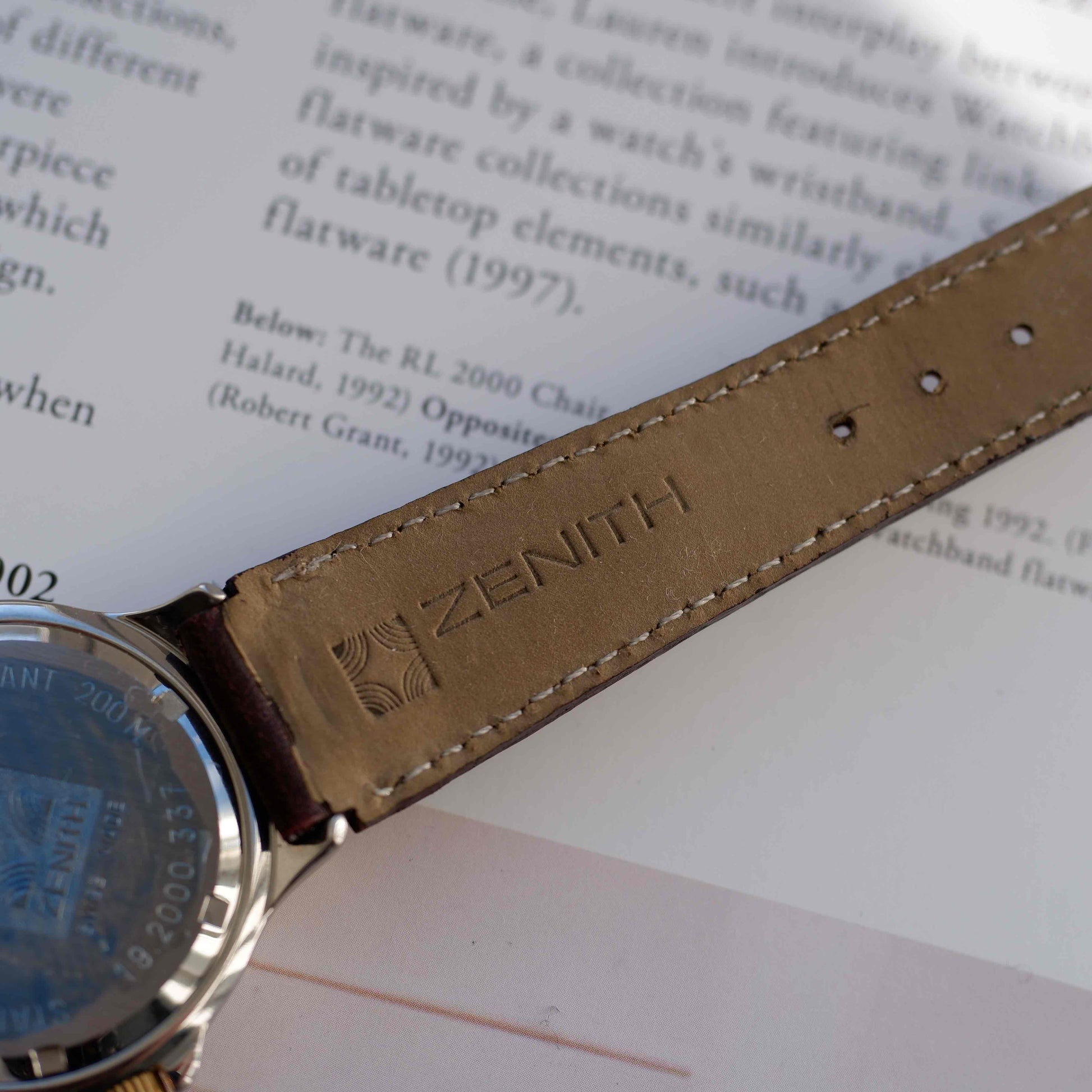 1990s Zenith Defy quartz watch featuring a blue sunburst dial with gold-tone accents, a two-tone stainless steel case, and a date display at three o’clock. A bold yet refined expression of Zenith’s sport-lux design heritage.